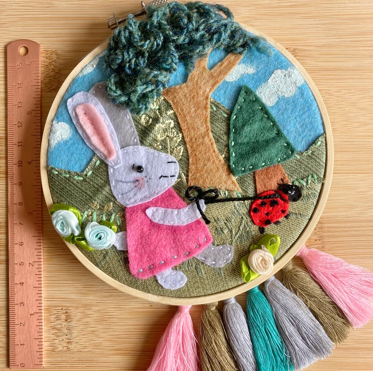 The picture is made from layers of fabric and felt and has been decorated by hand with embroidery and bead work. With a little ink and paint, it has been backed with a layer of felt to finish it off.