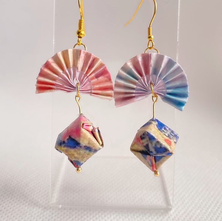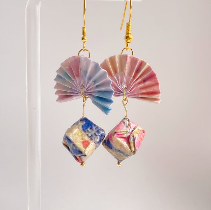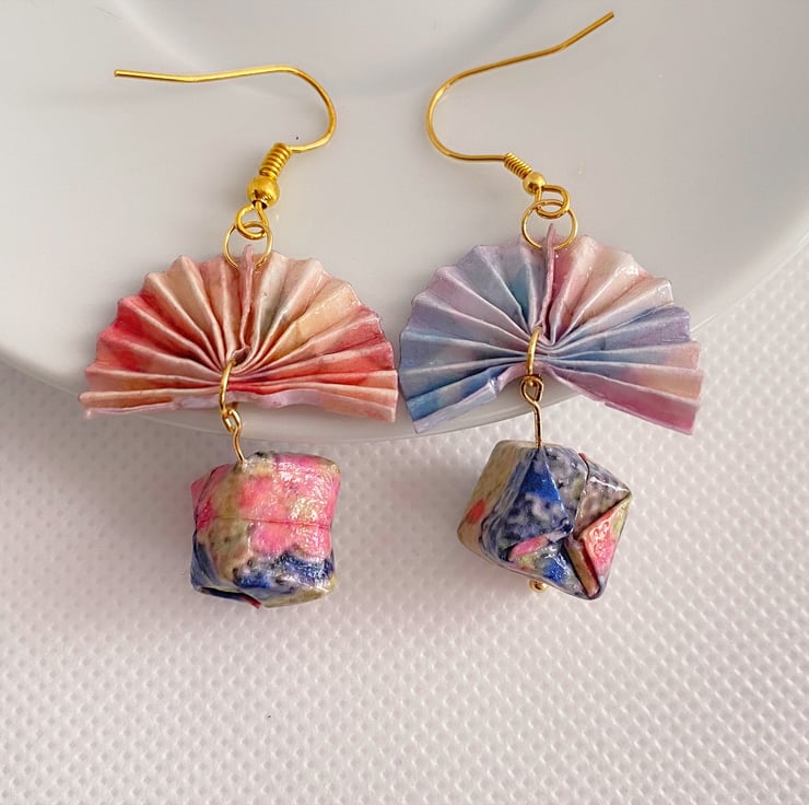 Origami Paper Fan and Spherical Dropped Earrings! The Gradient Pink Fan design showcases the artistry of traditional Japanese floral motifs. These spherical earrings are a unique blend of elegance and creativity, handcrafted with love. Make a statement with these one-of-a-kind accessories that exude sophistication and grace. Perfect for adding a touch of beauty to your outfit. Elevate your style with these must-have earrings!