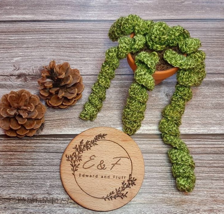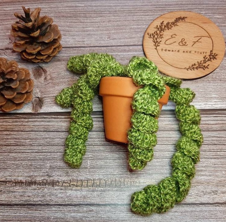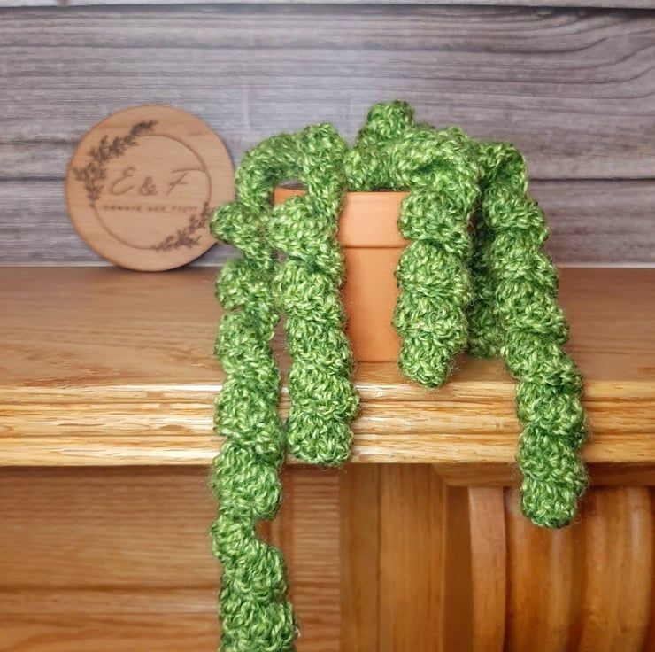 The plant stands on a dark brown crochet base and is securely attached to the pot. As each one is handmade, there may be subtle differences between them if you purchase more than one.