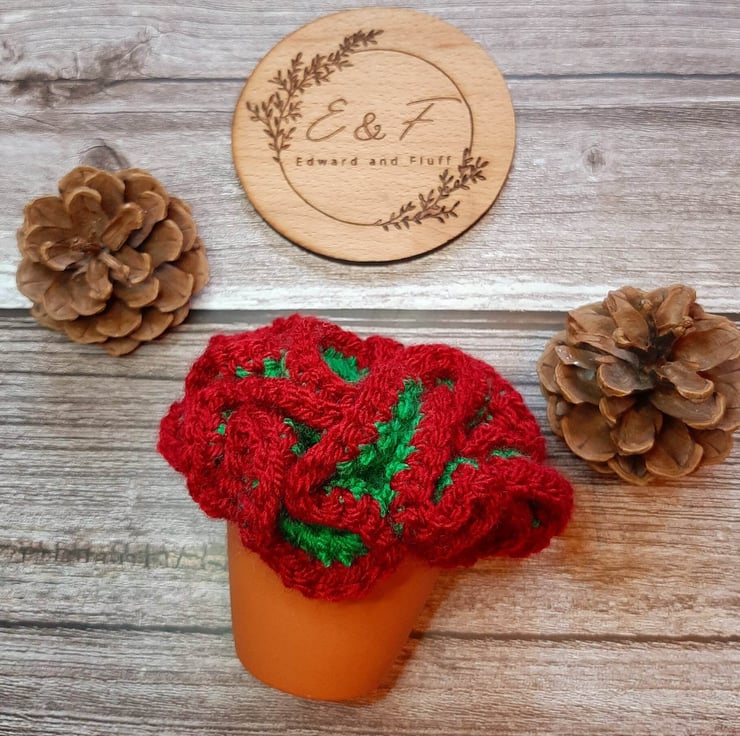 This gorgeous green plant with claret-coloured frills will look perfect on a desk or shelf in the home. This easy-care crochet plant sits in a terracotta plant pot and it doesn't need any special care at all. Just place it in your favourite spot or give it as a gift to someone special