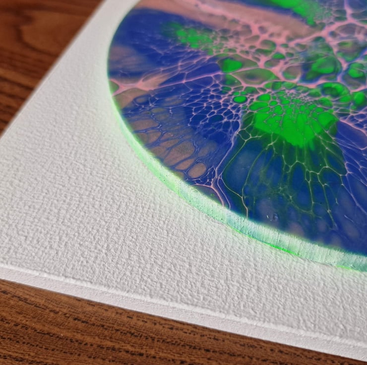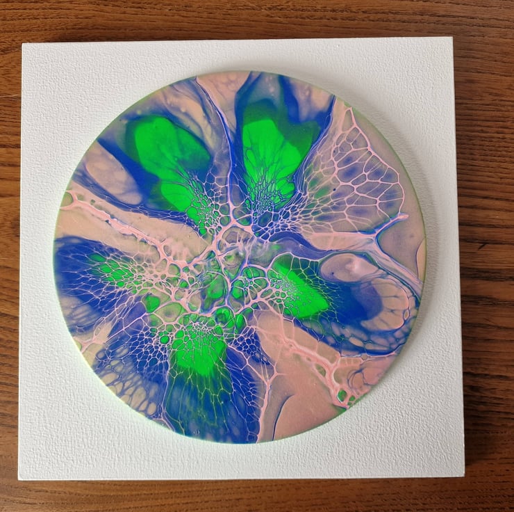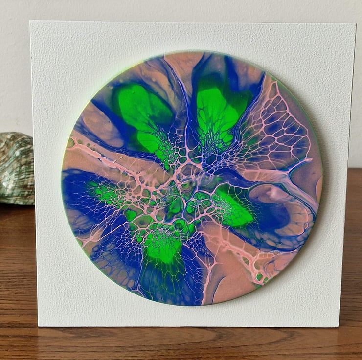 The diameter of the circular painting is 16.9cm, mounted on a 20.2cm x 20.2cm backboard.