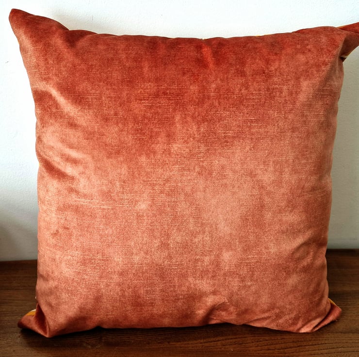 The back fabric is a plain, good quality, rusty-orange coloured velvet, giving the cushion cover a luxury feel.