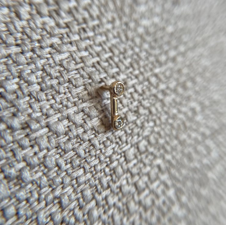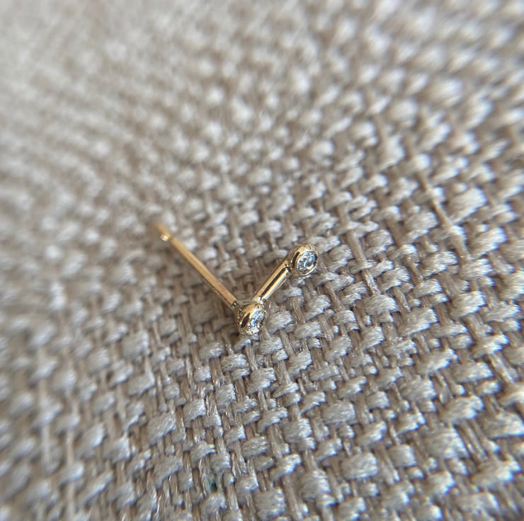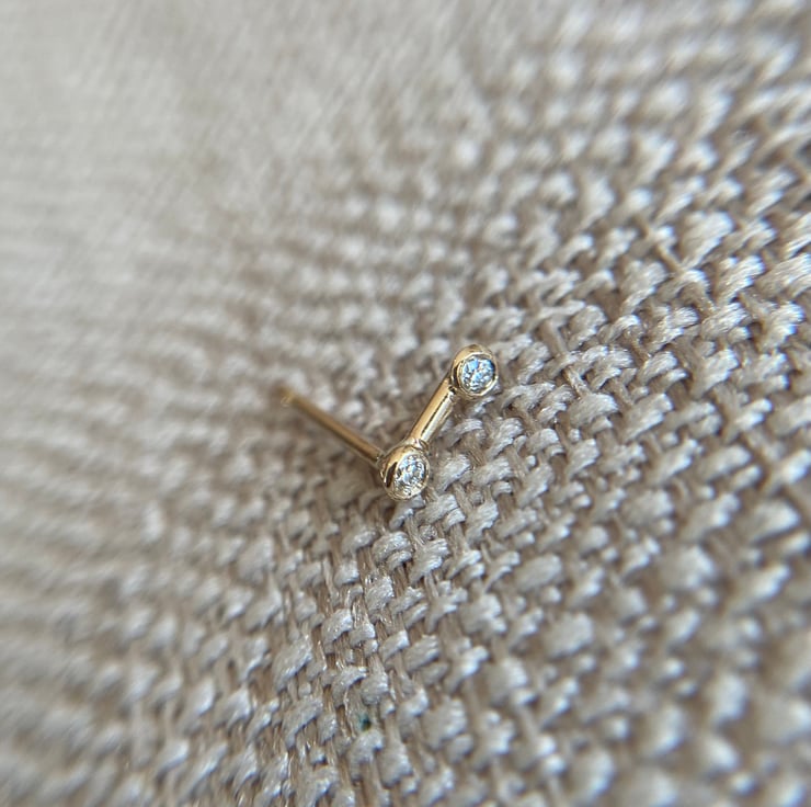 This is a single ear stud bar with two genuine natural diamonds set in solid 9ct yellow gold.