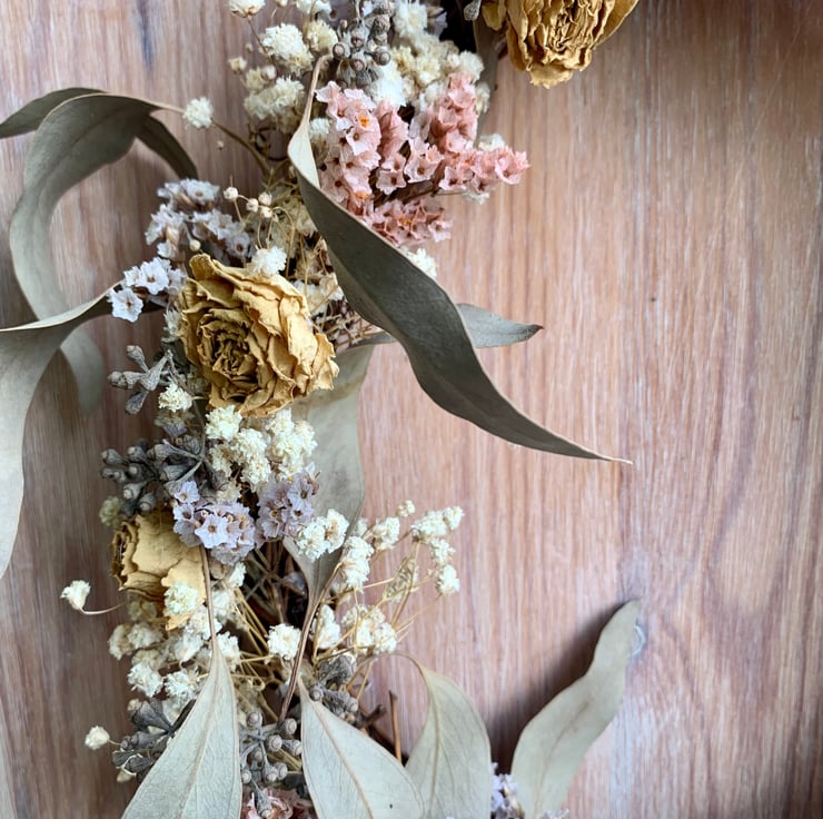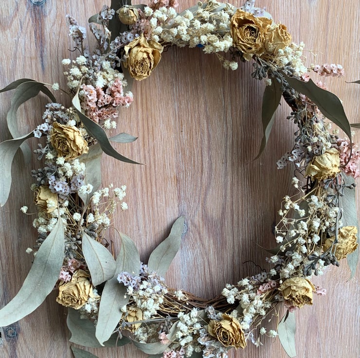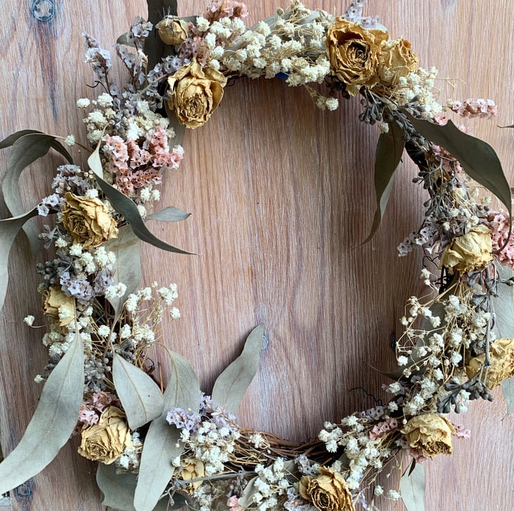A natural style rustic dried flower wreath suitable to hand on a wall or door indoors.