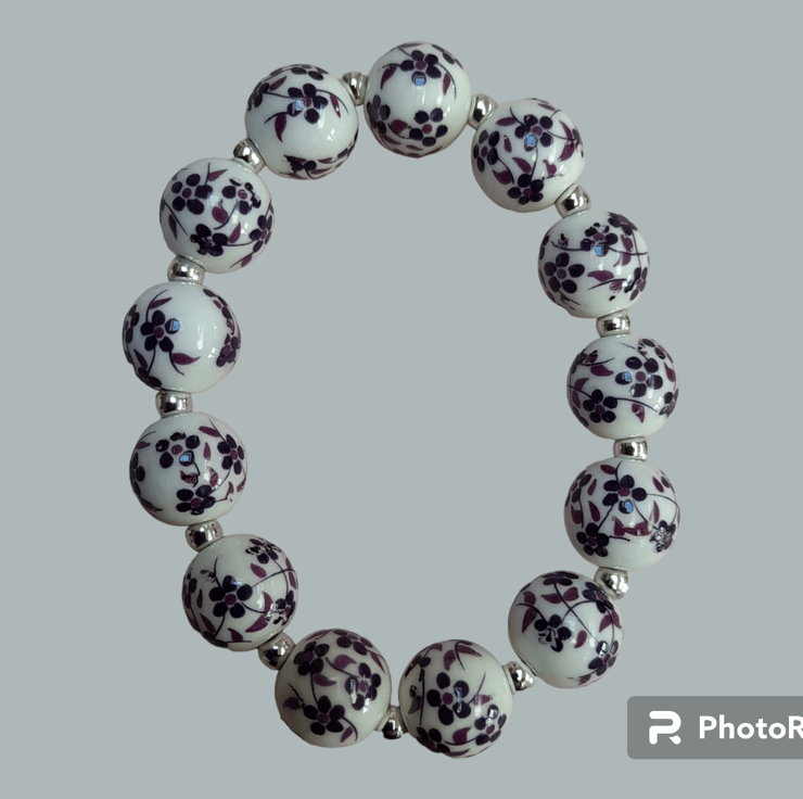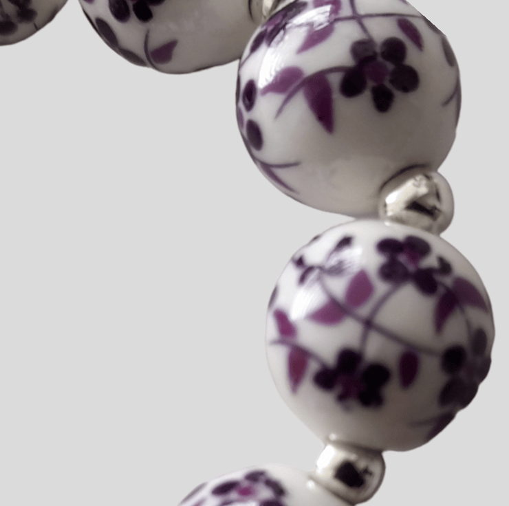 Pretty lilac floral beaded bracelet with small silver plated spacer beads, elasticated. White ceramic beads with gorgeous lilac flowers.