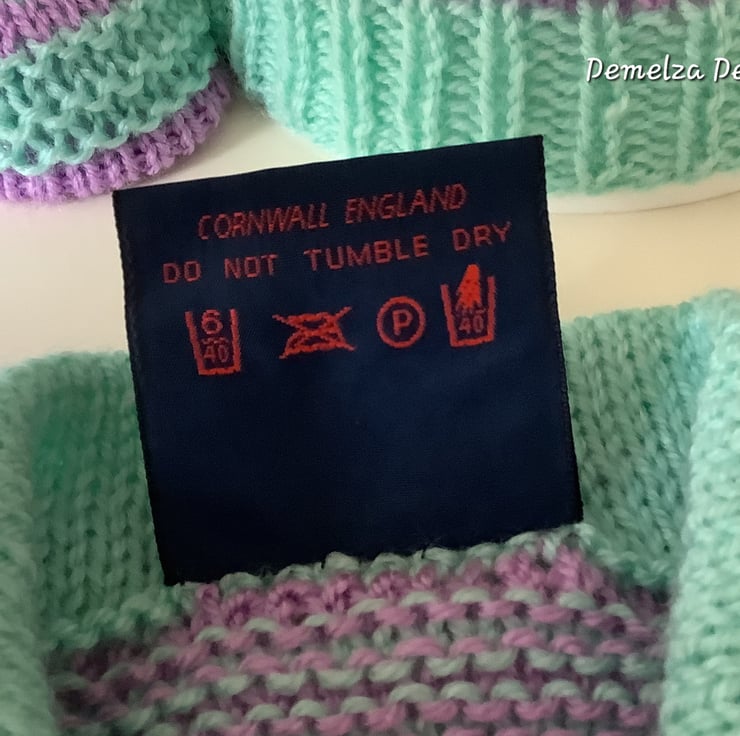 Baby knitwear is designed and hand crafted by Demelza Designs in Cornwall meeting UK baby safety standards, Only branded premuim acylic, acrylic/natural fibre blends or pure natural fibre yarns are used in baby knitwear which conforms to BS984/76 standards.