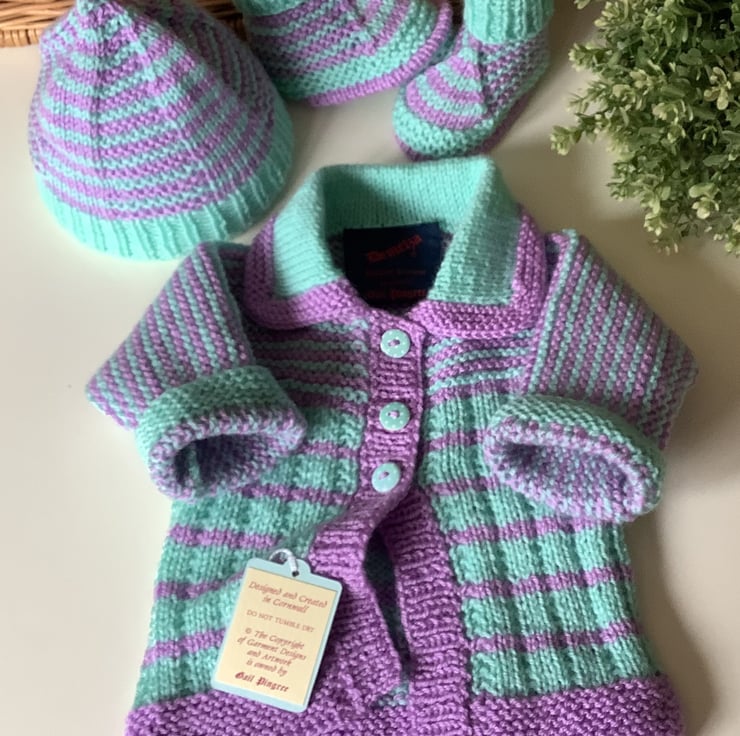 This gorgeous cosy baby jacket, hat and booties set has been lovingly designed and hand crafted using quality branded premium machine washable mixed fibre yarns including cotton and wool.