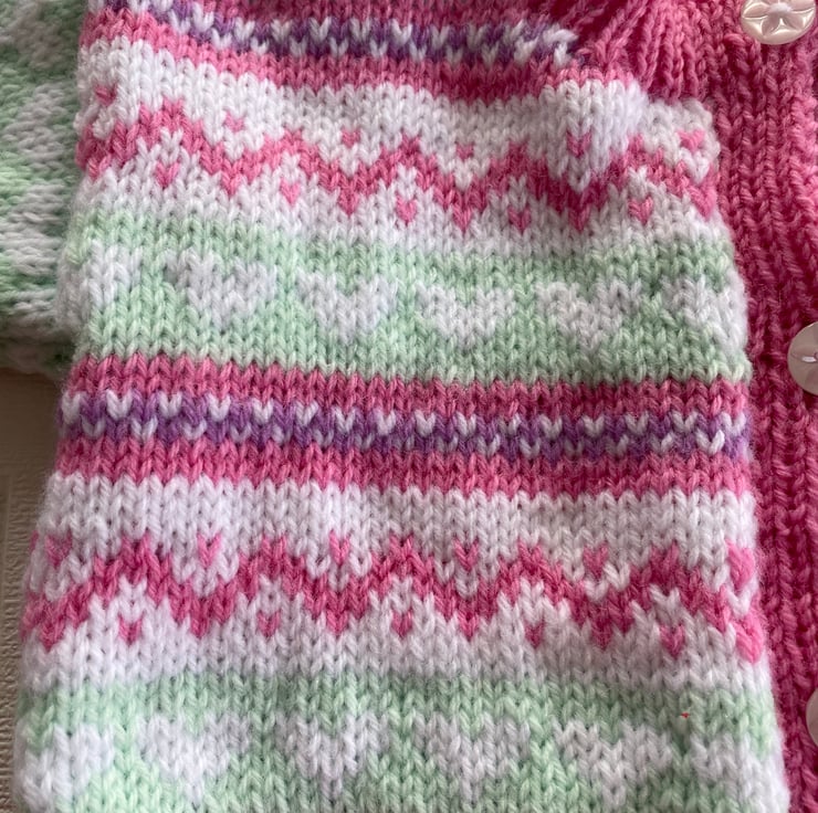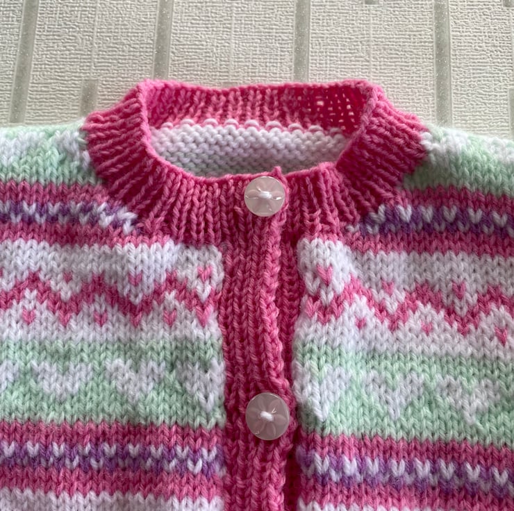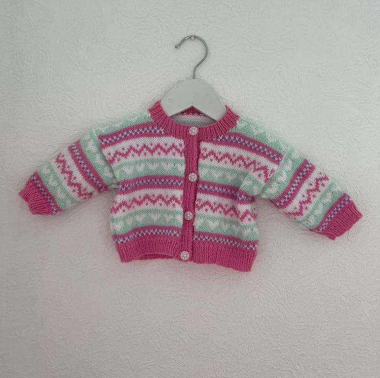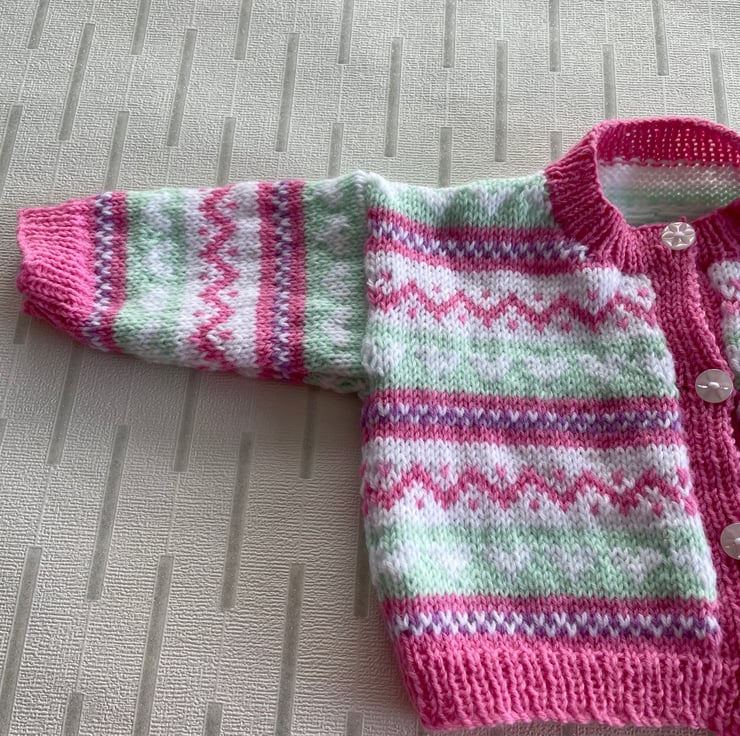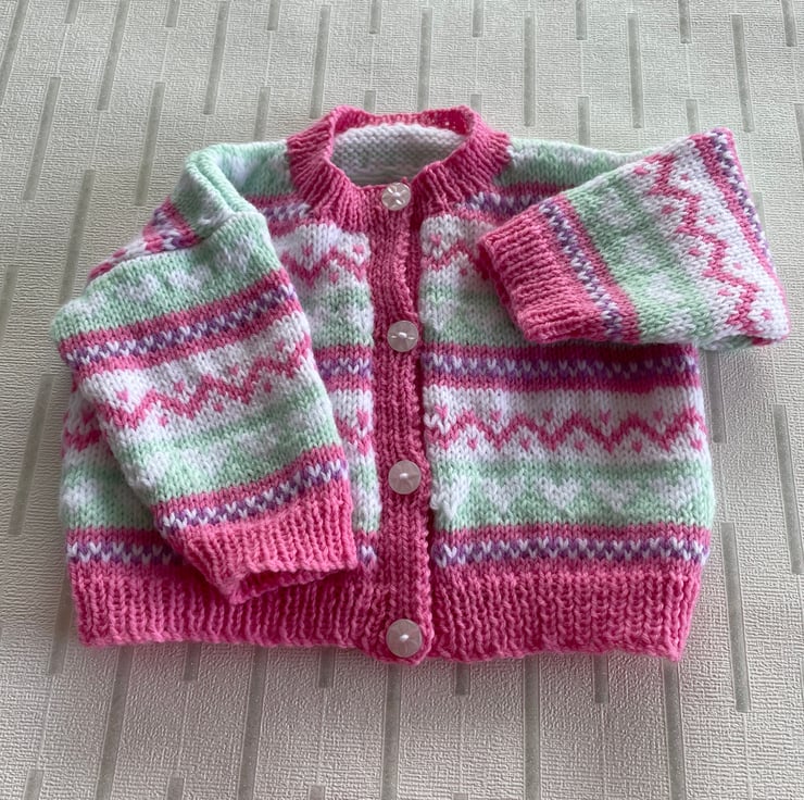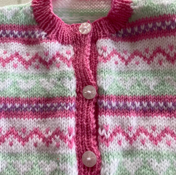 This pretty cardigan is hand knitted in a soft fine baby yarn. It is worked in fair isle bands with a round neck and fastens at the front with 4 white buttons. The ribs and bands are knitted in pink and the fair isle bands are in mint, white, pink and purple.