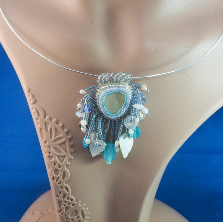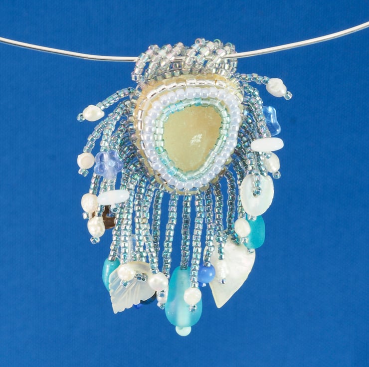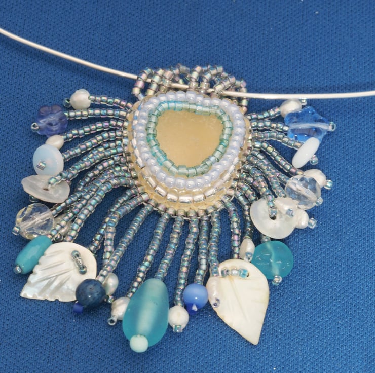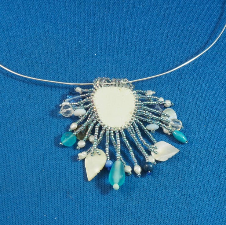 A small piece of white sea glass with rows of seed beads around it in shades of blue, silver and white. back of the pendant is fine, white leather. The pendant is finished with a row of rainbow, irridescent finished blue beads which conceals the edges of the backing and the support medium. The same beads are used to make hanging strands all around the edge, either side of 6 small hanging loops made of the same beads again.