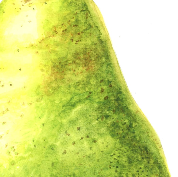 For this original piece of artwork, I've chosen a ripe pear to paint with a lustrous golden-yellow skin, mottled with tiny brown flecks and slightly dimpled, paying lots of attention to detail.You can almost feel its waxy skin if you were to reach out and touch it!