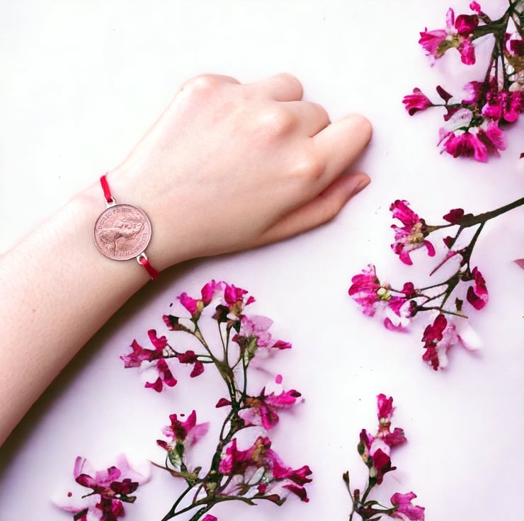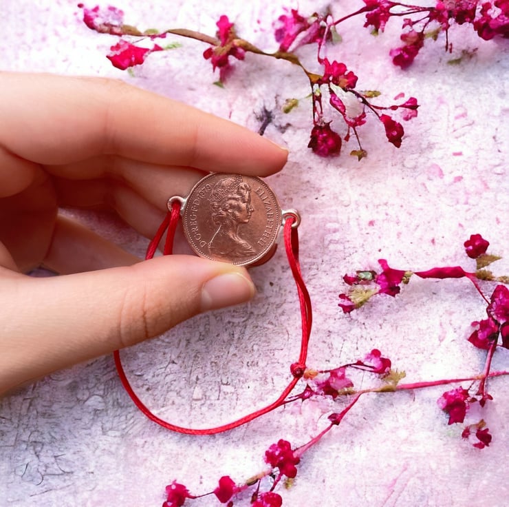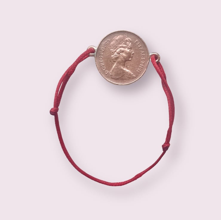 A beautiful bracelet made with a genuine 1979 2 new pence coin with a red cord, the perfect gift for a 44th Birthday for her