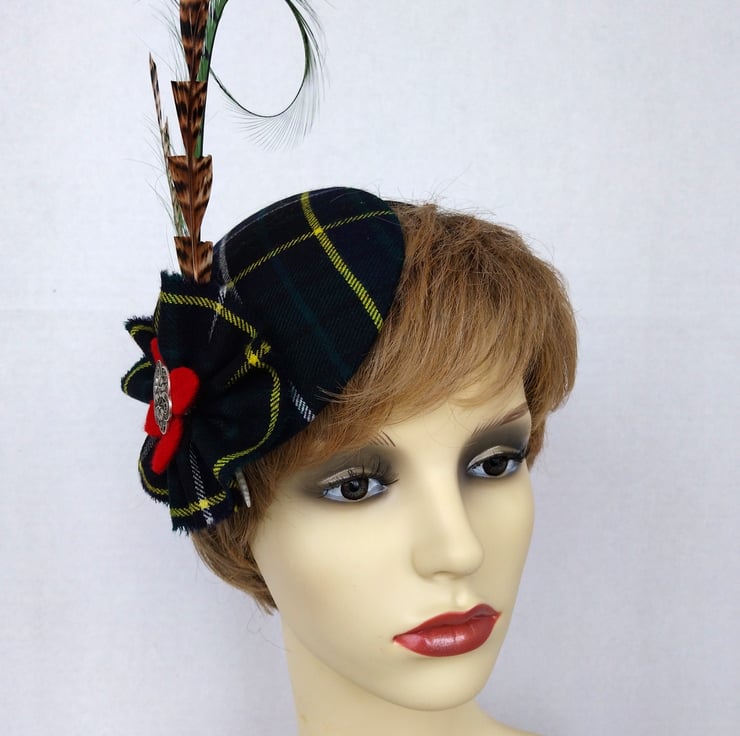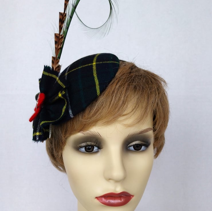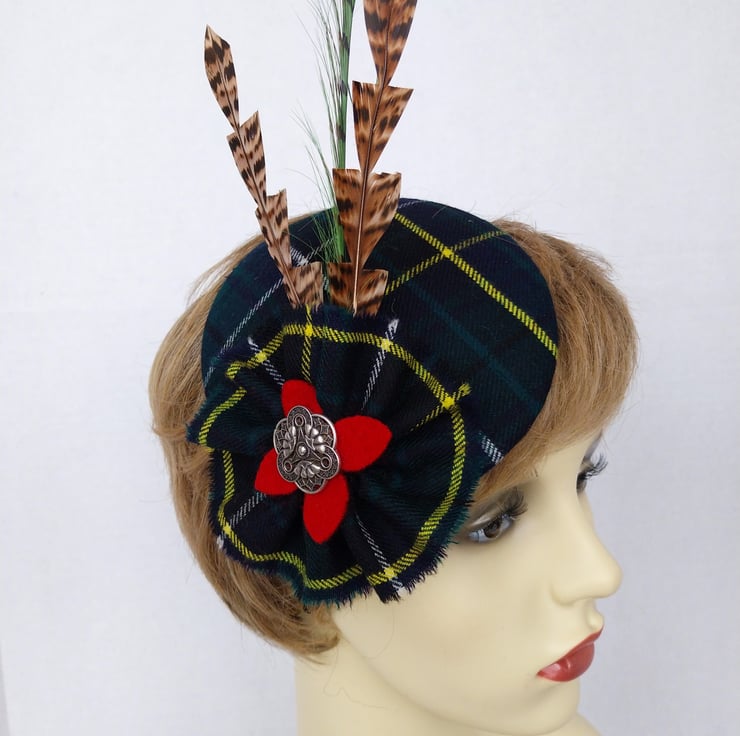 It measures 12cm diameter and is adorned with grouse feathers hand cut in a sawtooth shape as well as a curled feather in green. The fascinator sits on a black fabric covered hair band. It is further embellished with a tartan ruffle, red felt motif and a metal button.