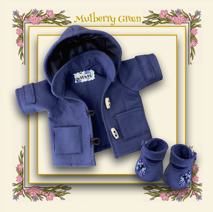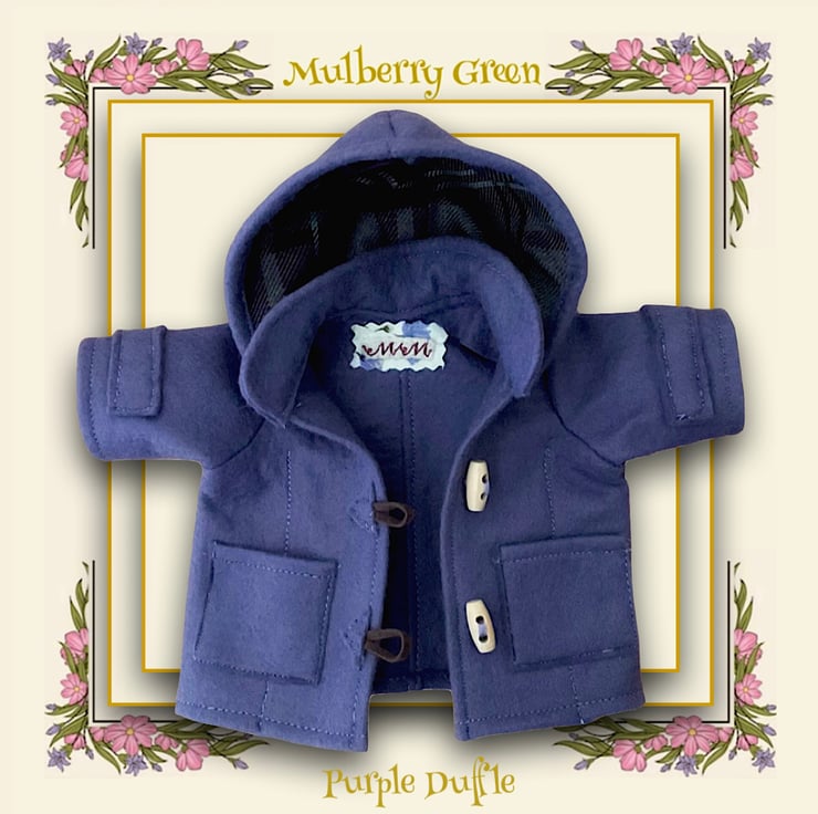 A lovely little purple duffle coat with a tartan lined hood to fit the Mulberry Green dolls. The coat has a hood, little pockets, sleeve tabs and leather loop button fastenings.