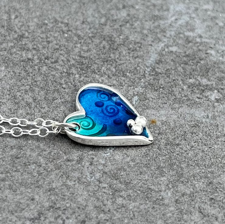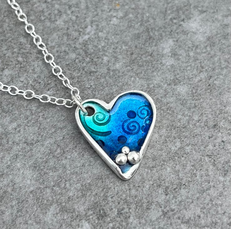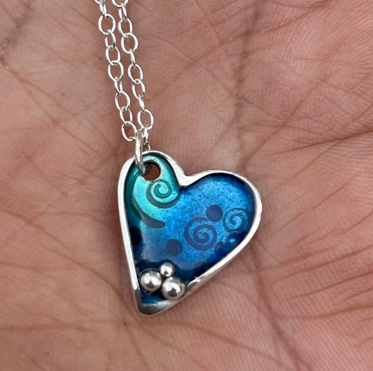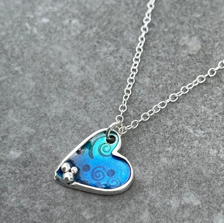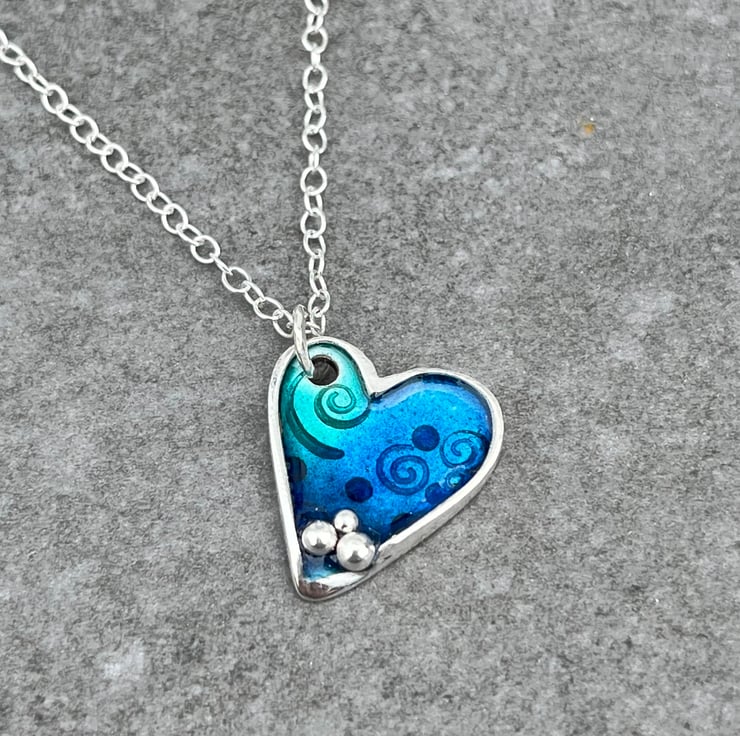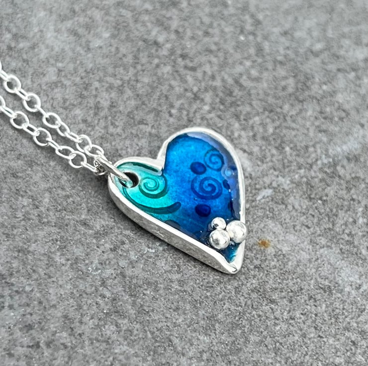 This enamel necklace is made from Sterling Silver. The enamelled Heart pendant has blue and turquoise enamels over an ocean themed pattern including fishes and shells and Fine silver ‘bubbles’ detail. The pendant measures approximately: 2.5cm in height and hangs on an 18” Sterling silver chain.