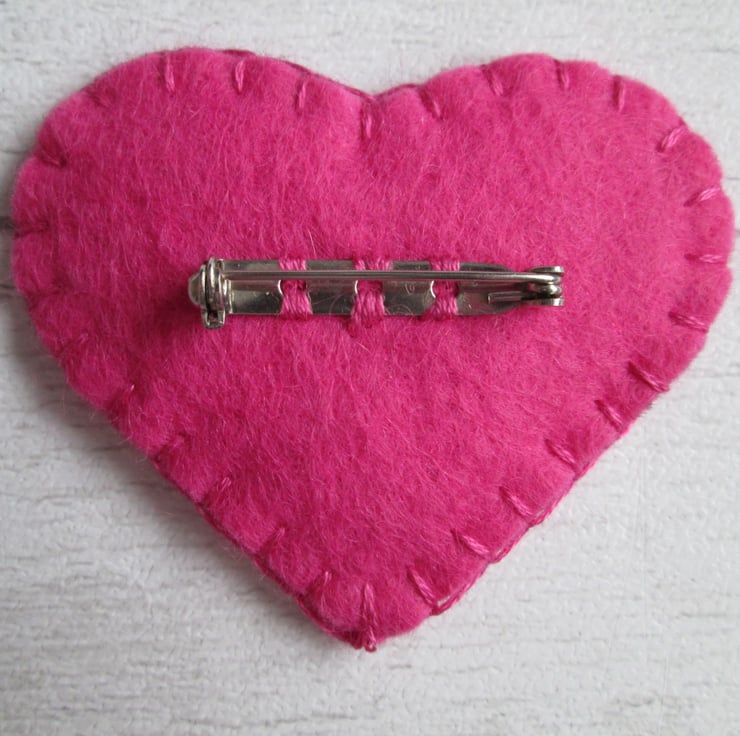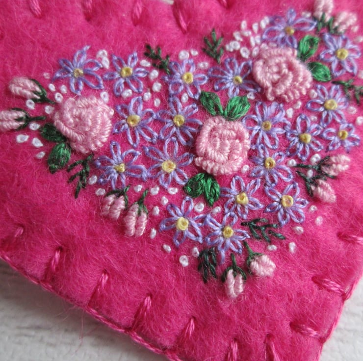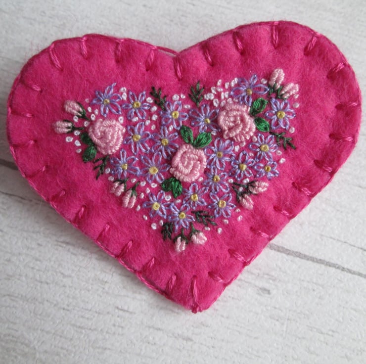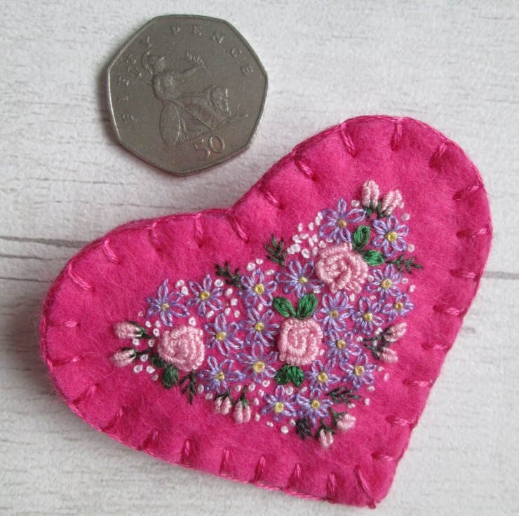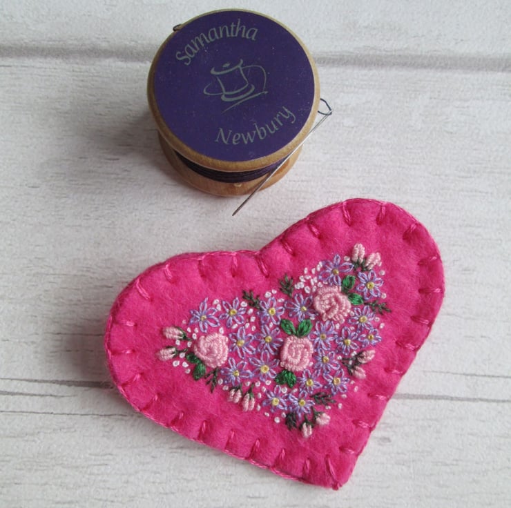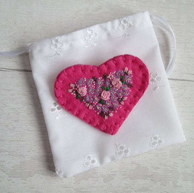 This cerise wool felt brooch has been hand embroidered with a profusion of tiny, pale pink roses and rosebuds, lilac daisies and white gypsophila. Edged with pink blanket stitch and finished with a metal brooch fitting, it is presented in a small drawstring bag made from white broderie anglaise. It measures 7 cm wide by 6 cm deep and would be equally at home on a summer frock or a denim jacket.