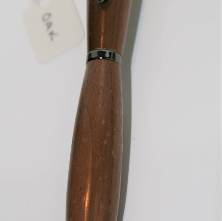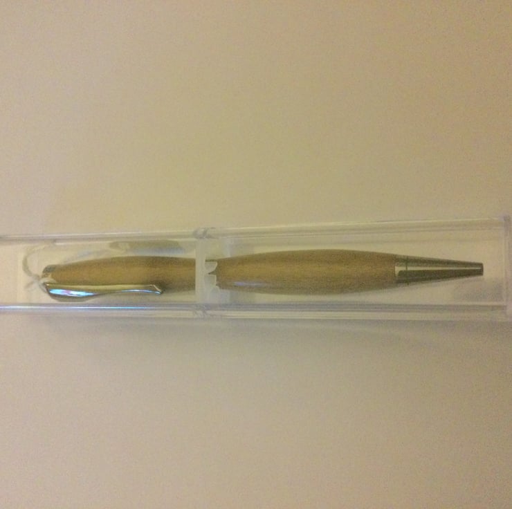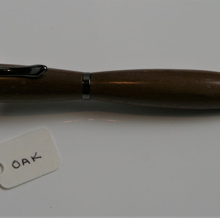 An exquisitely beautiful handmade pen that would make the perfect gift. Made from oak, the wood is hand turned using a lathe. It is then fine sanded and finishing oil applied. It has a good weight to it and the contours of the pen make it a pleasure to use. The gun metal features complement the oak wood. This pen comes with black ink and requires a standard refill.