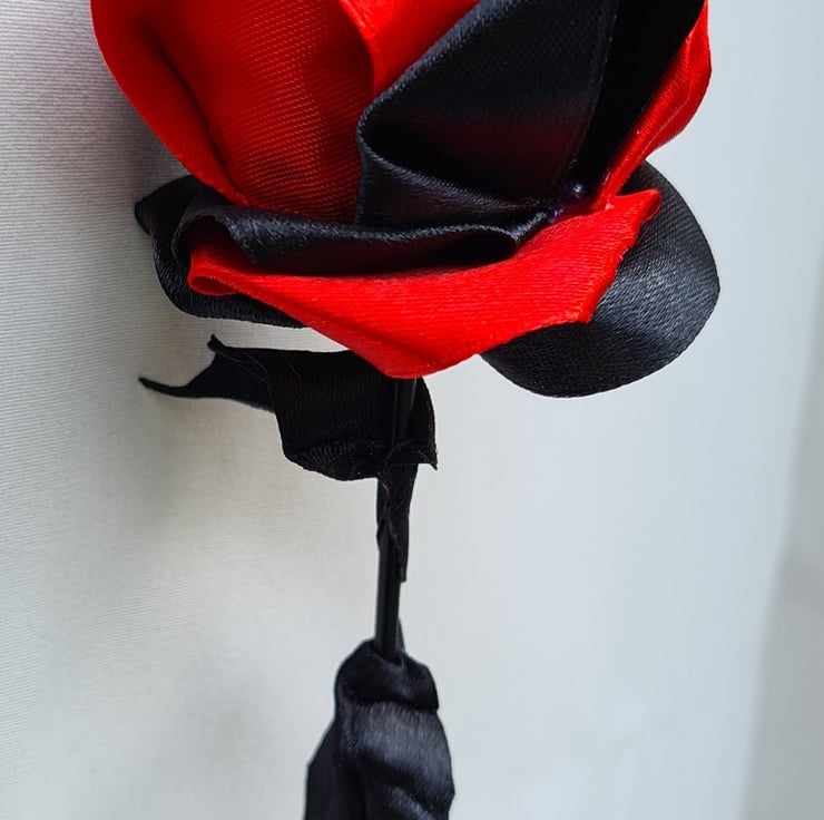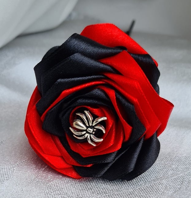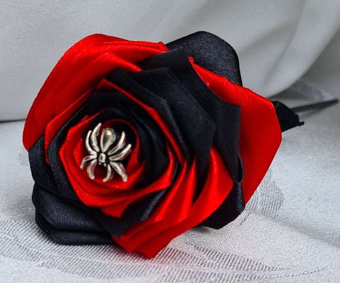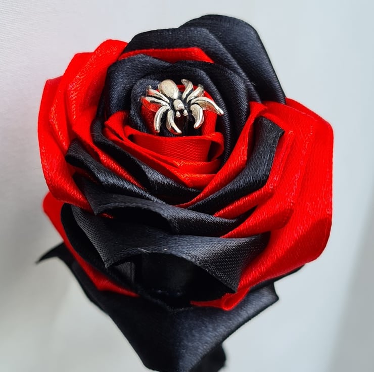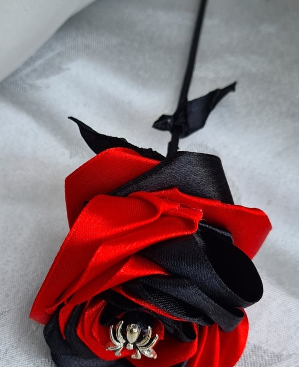 A gorgeous handmade single stem rose (one flower only), made with a stunning combination of Black & Red Satin (Polyester) ribbon with a Silvery Spider in the centre of the petals. The stem is made from bamboo (Non-bendy) and painted Black with Black Satin ribbon leaves.