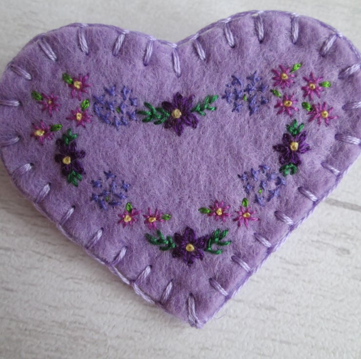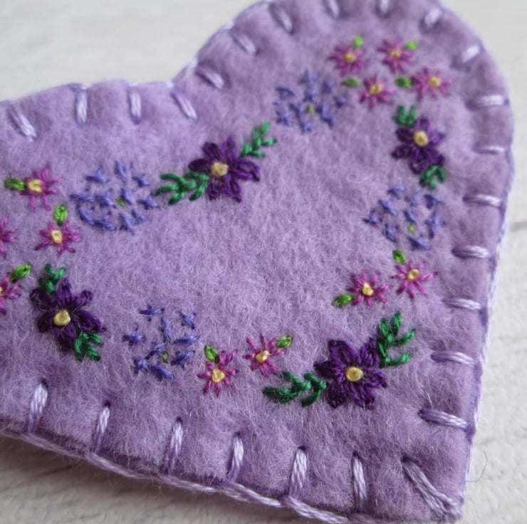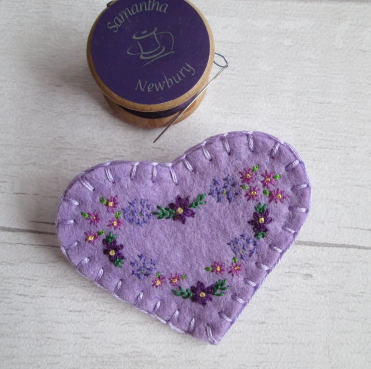 Hand Embroidered Floral Heart Brooch on Lilac Wool Felt