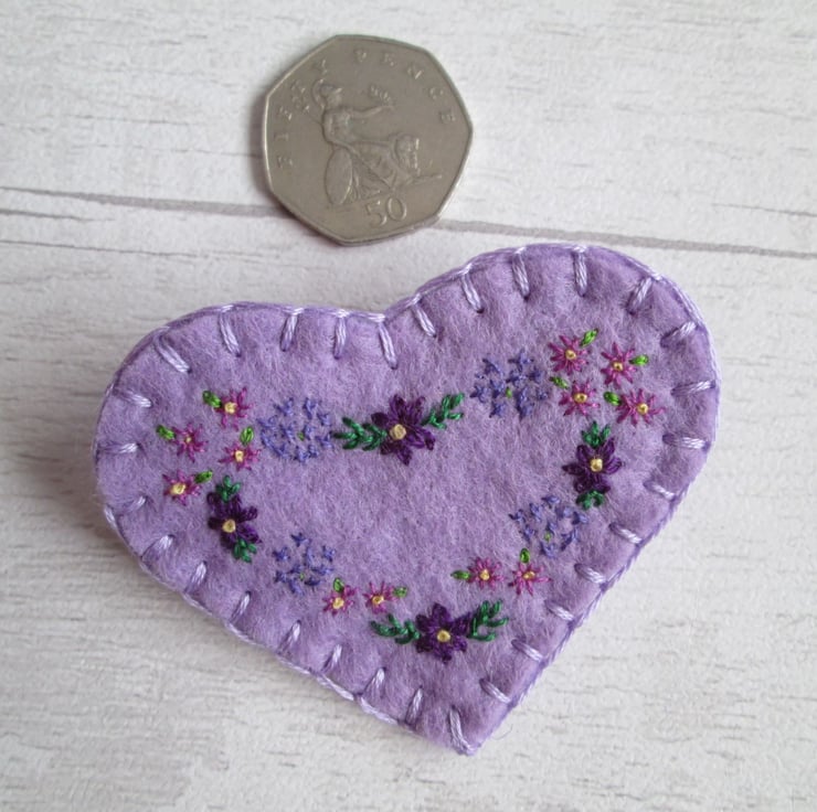 A dainty little heart-shaped brooch in lilac wool felt, hand embroidered with a wreath of flowers in shades of purple and pink - dark purple clematis, lilac alliums and little pink daisies. I have finished it with lilac blanket stitch and added a metal brooch fitting. Measuring just 7 cm wide by 6 cm high, it is presented in a drawstring pouch made from white broderie anglaise.