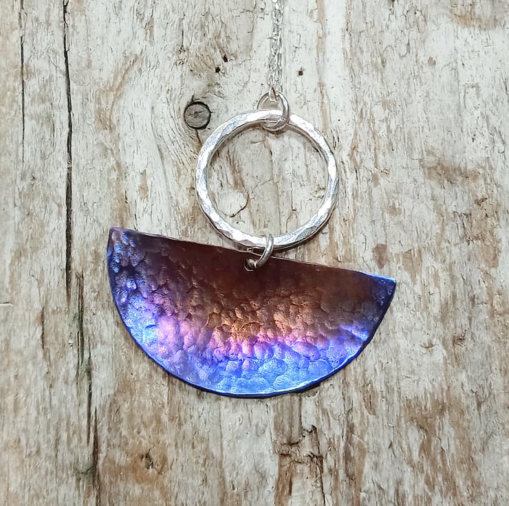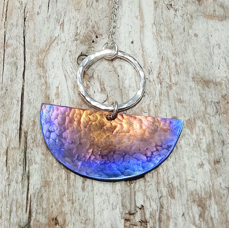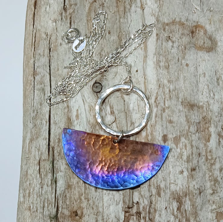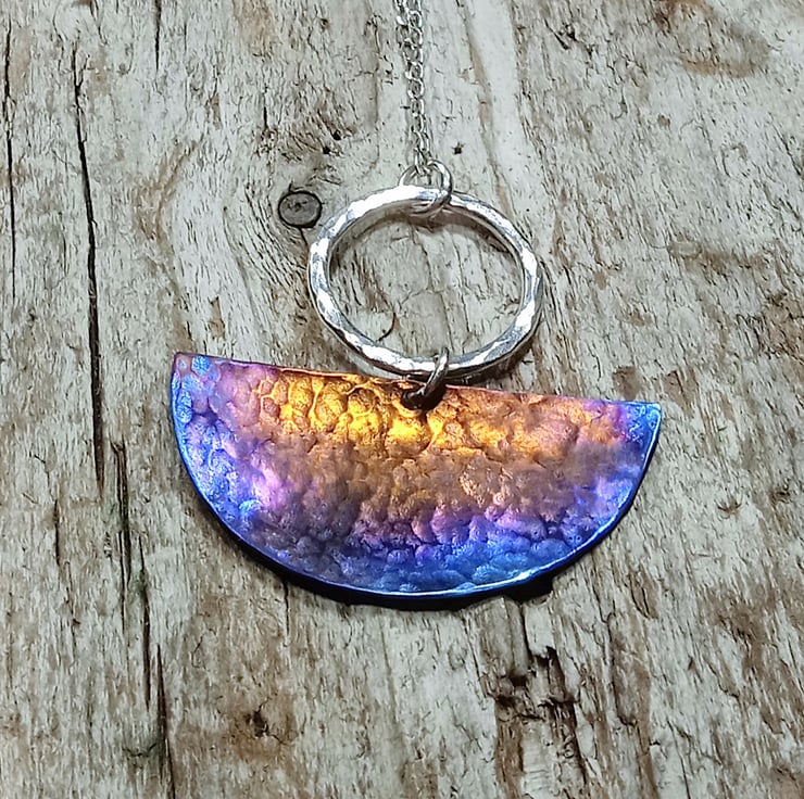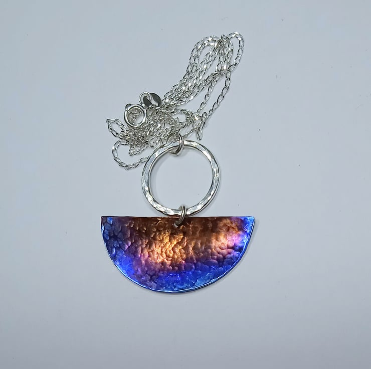 I have made a 1.8 cm sterling silver hoop and have given it a hammer textured finish. I have hand sawed a 3.5 cm wide semi-circular shape from titanium sheet and given it a hammer textured finish to create subtle shaping before colouring. I have attached this to the hoop with a sterling silver jump ring. The pendant measures approximately 3.6 cm long and is hung from an 18 inch sterling silver chain.