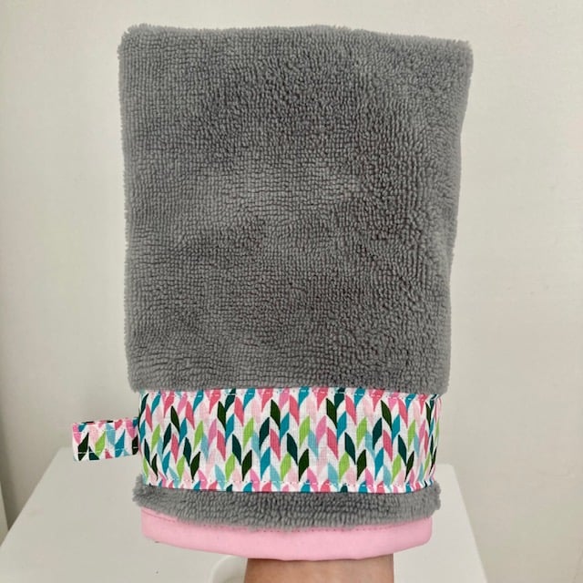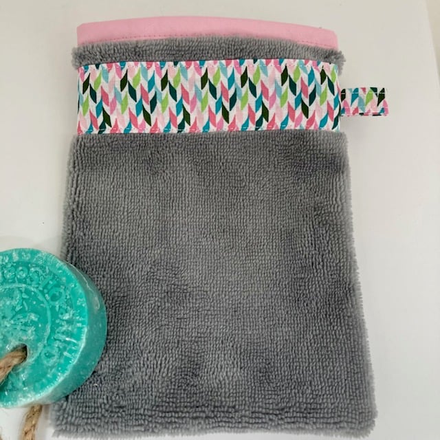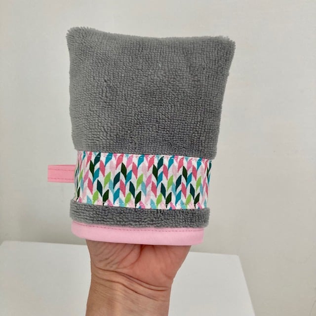 These Wash Mitts are made using a l ight grey bamboo towelling fabric and have a decorative collar and a hanging loop. The top edge has been finished using a contrasting bias bindnig.