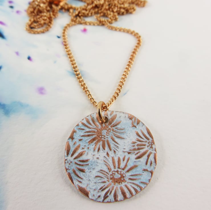 1.5cm copper disc textured by hand using a daisy stamp. Painted front and back with enamel. Hanging on an 18inch rose gold plated curb chain. Delivered in a gift box with information about the enamelling process. Each one unique and made to order.