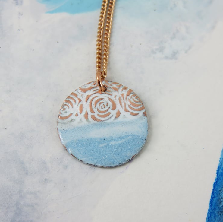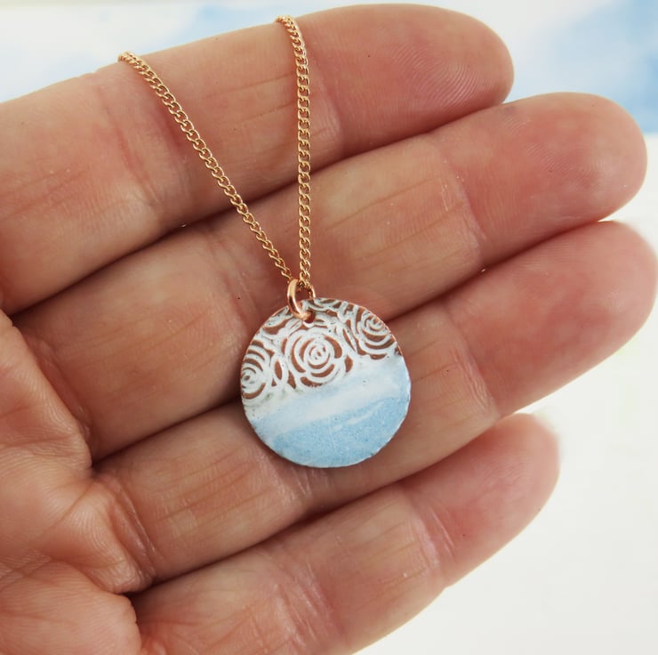 1.5cm copper disc textured by hand using a rose stamp. Painted front and back with enamel. Hanging on an 18inch rose gold plated curb chain. Delivered in a gift box with information about the enamelling process. Each one unique and made to order.