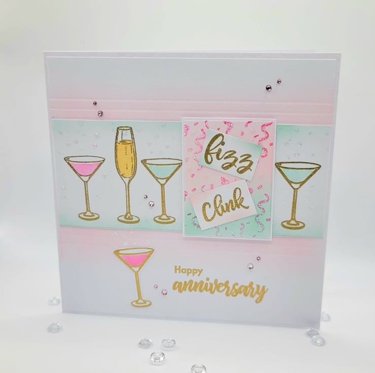 The card base is quality white hammered card and the top layer is smooth white card. There is a label stamped with party streamers and FIZZ and CLINK. The sentiment reads HAPPY ANNIVERSARY also in gold embossed stamping.
