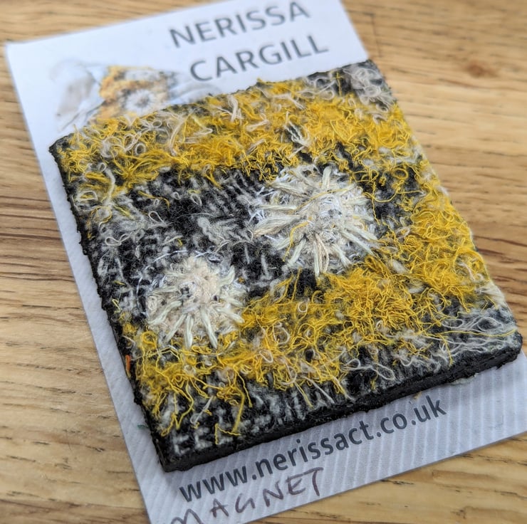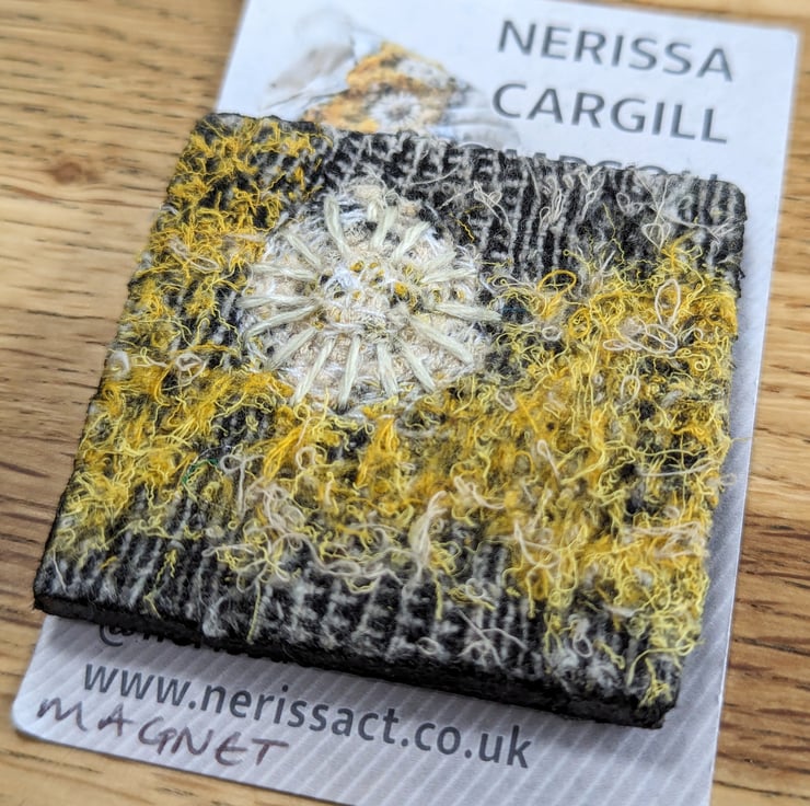 Unique piece of textile art, perfect for sea lovers. Recycled fabric embellished and embroidered with coastal inspired textures in a bold palette of golden yellow tones with hand finished shell motifs.