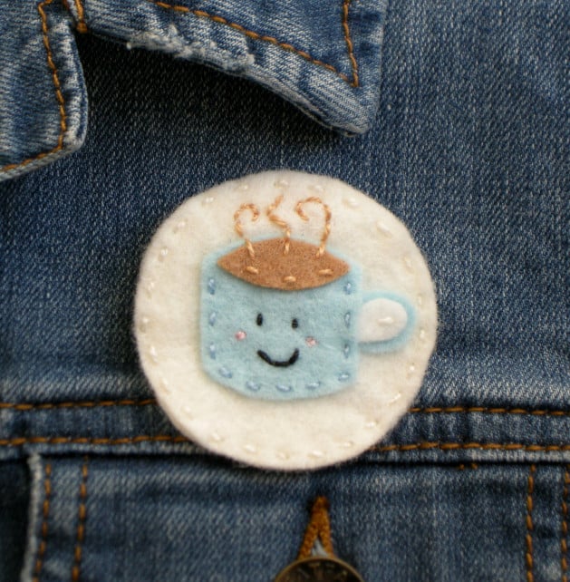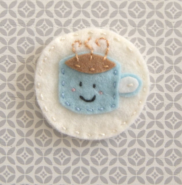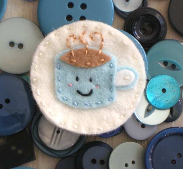 The smiley tea cup would brighten up any jumper, coat, scarf or bag.