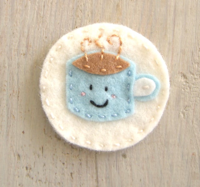 A smiley tea cup handmade felt pin badge. The brooch has been designed and hand cut from good quality felt and then hand sewn with embroidery thread and attached to a printed original drawing.