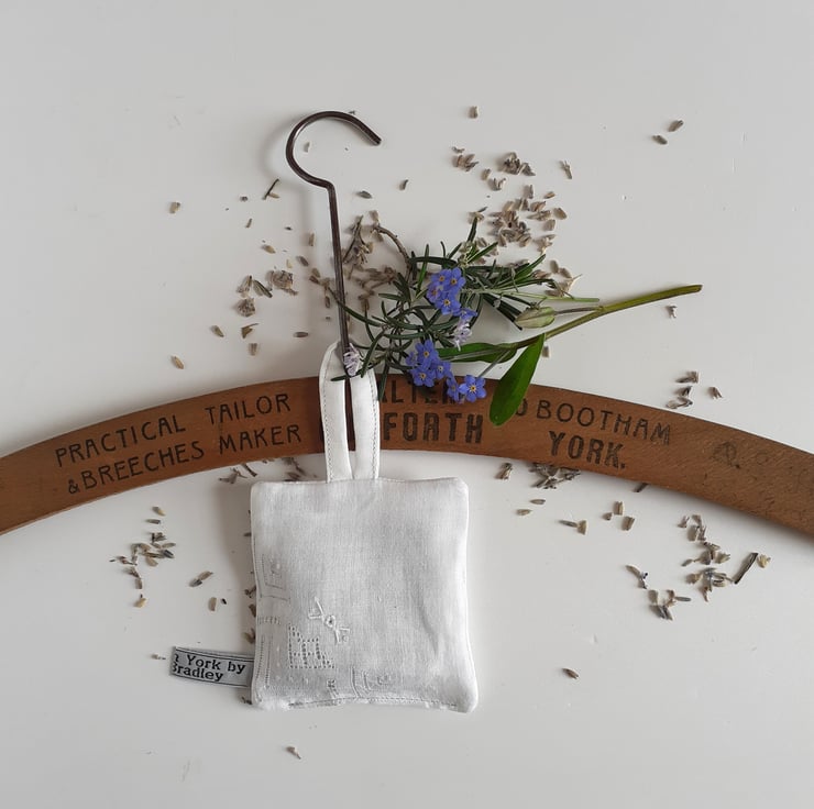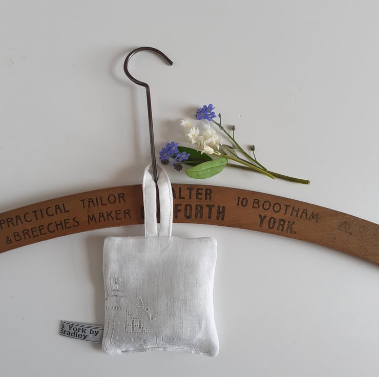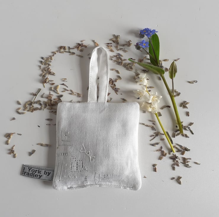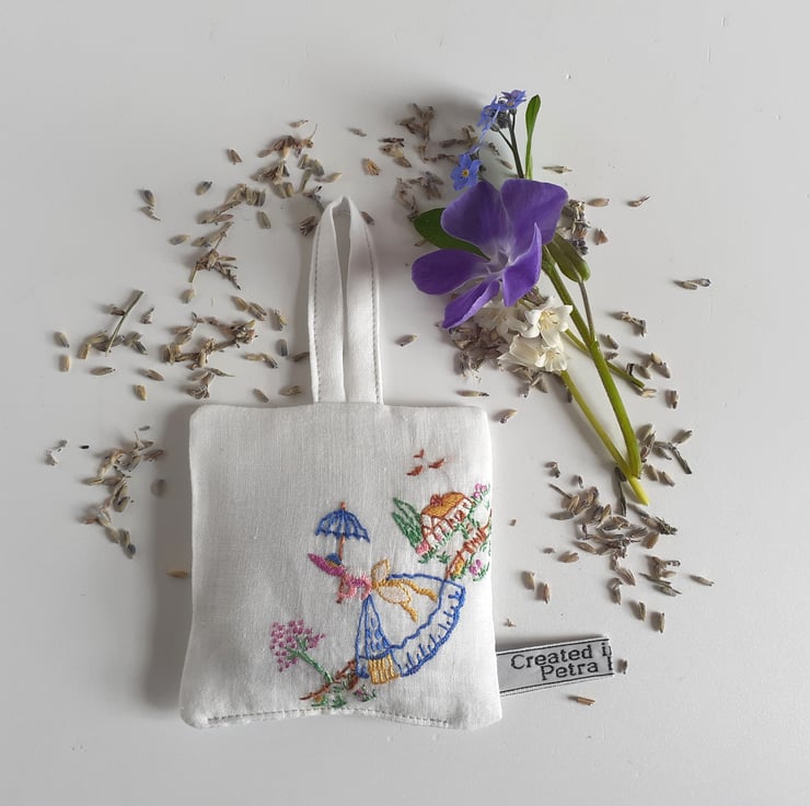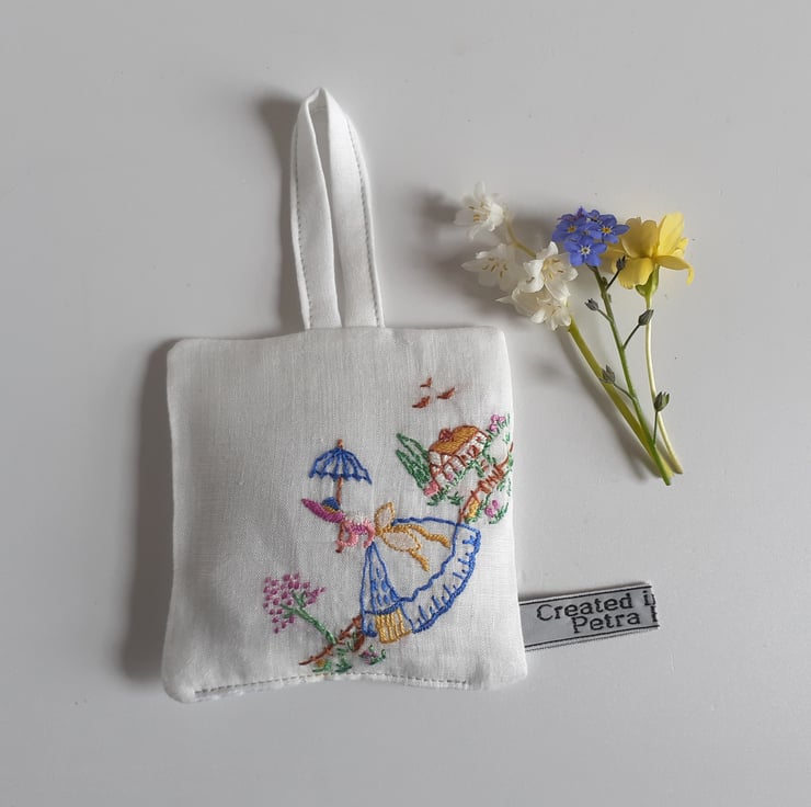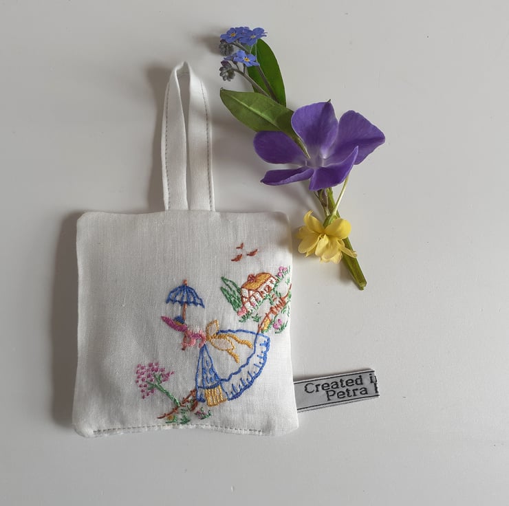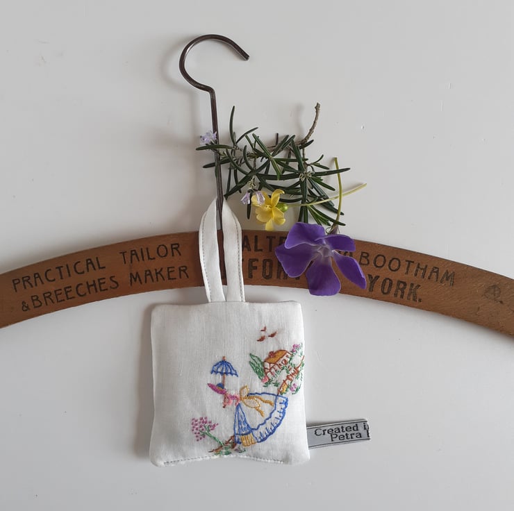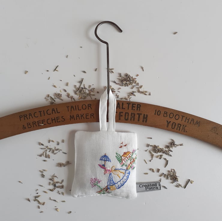 This lavender bag is made from an embroidered hanky from one of those boxed up vintage gift sets. Altho some of the fabric had rust marks from the pins, I was able to salvage enough for a sweet vintage embroidered lavender bag. The front is a pretty crinoline lady in her garden complete with thatched cottage! Inside is a little muslin bag filled with lavender from the Yorkshire Wolds. There is a hook to hang it up and admire this tiny piece of handiwork, or pop it over a clothes hanger and keep away pesky moths. Lavender is that old and simple remedy for a good nights sleep, so put this little lavender bag under your pillow to help you rest.