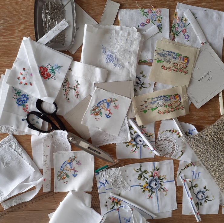 Hi there and welcome to my shop. Here you will find old embroideries, vintage fabrics and sparkling remnants made into something pretty and practical once again. I re-stock slowly but surely, so do keep coming back for a browse.