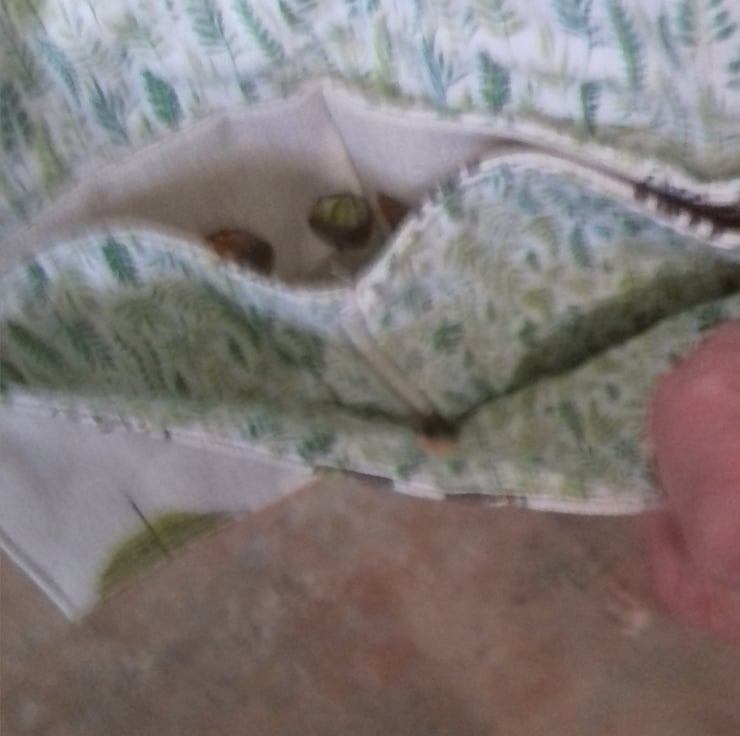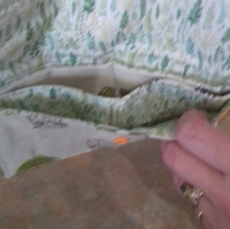 The lining of the purse is cotton fabric with small green leafy print on white background.