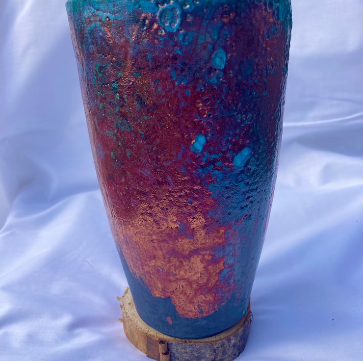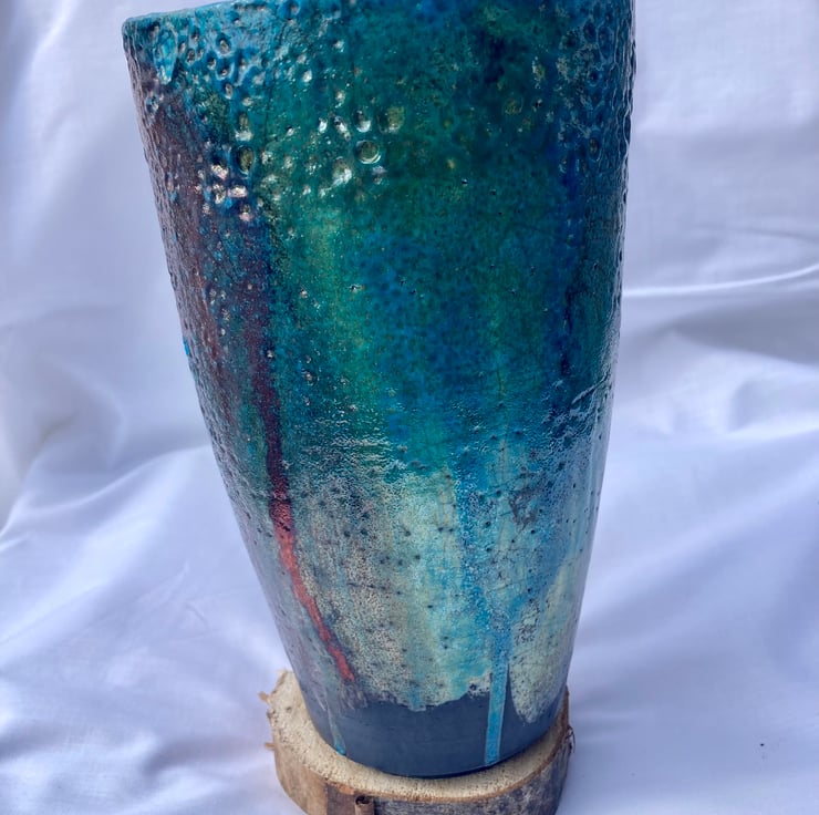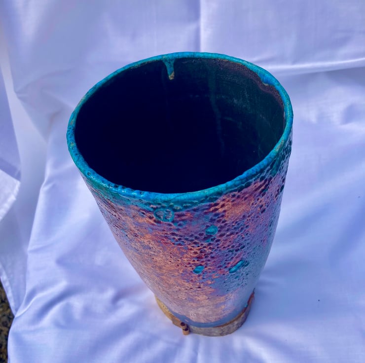 This is a larger Raku vase which I love for the richness and depth of colour mixed with the smokiness of its creation. The clay body has a smooth texture and is glazed with a copper based glaze which has a burned out bronze colour contrasting with the turquoise base colour.The glaze and firing process bring heavy texturing to the surface I have used wax resist an dipping techniques to leave raw fired clay which have been smoked black adding contrast. There are irregular thrown ridges on the sides which give the vessel movement and life.The glaze has crazed nicely over the rim. This is not suitable for food, but should hold water for flowers.