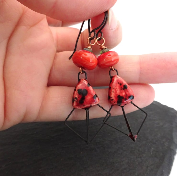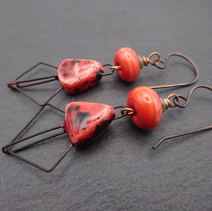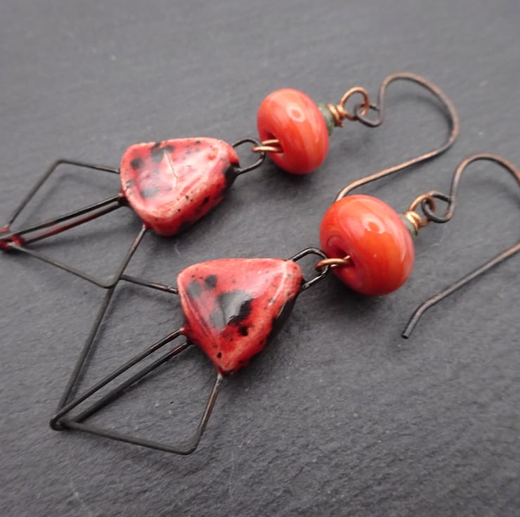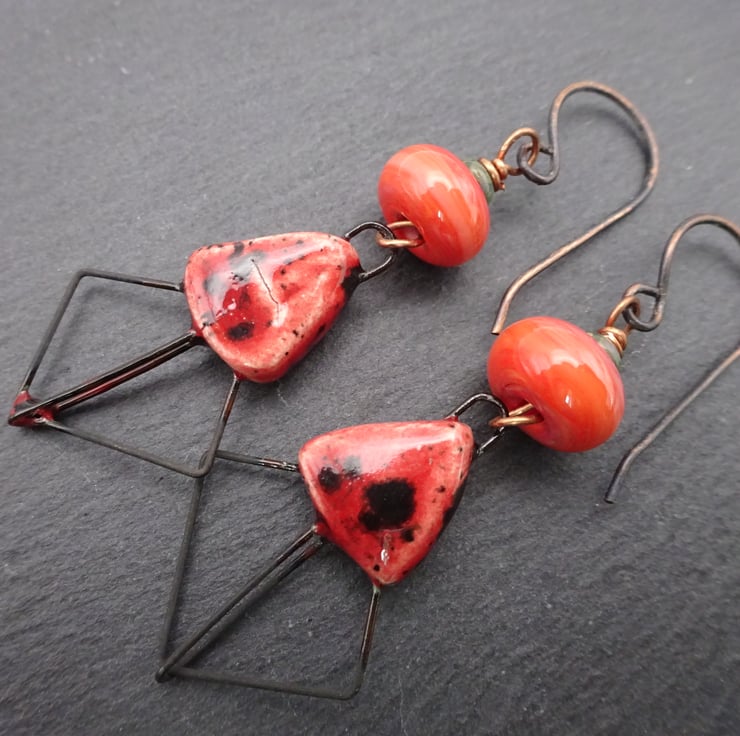A pair of earrings made with handmade copper ear wires, handmade lampwork glass beads and handmade ceramic drops with a coral pink glaze.