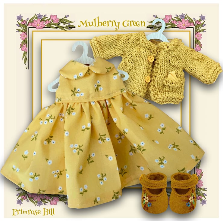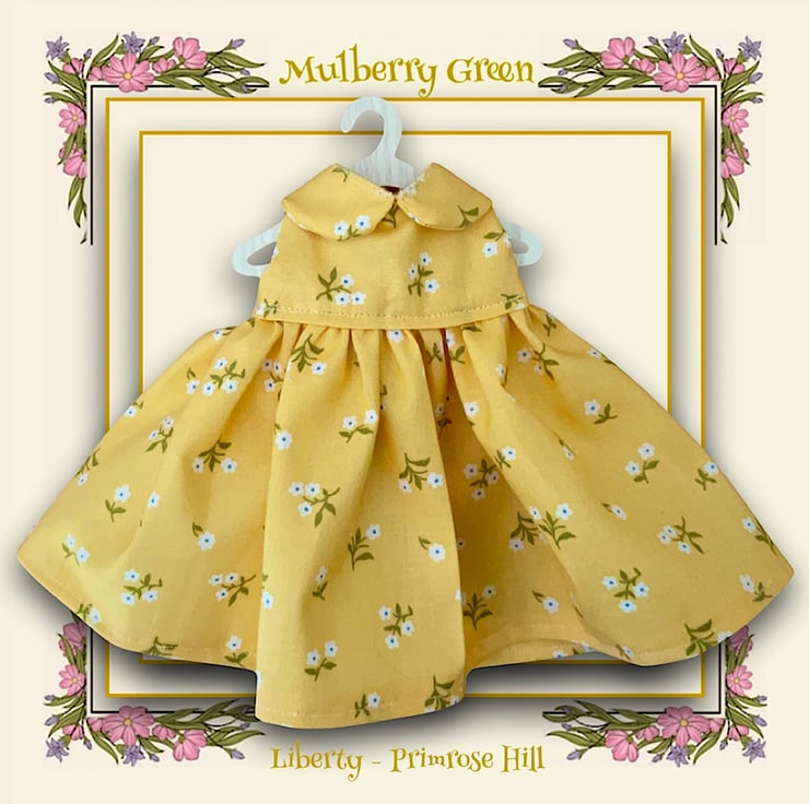 A beautiful little Liberty print dress - Primrose Hill, to fit the Mulberry Green dolls. The dress is handmade from best quality Liberty cotton, has a lined bodice and a Peter Pan collar and fastens at the back with a little popper. There is a matching yellow cardigan.