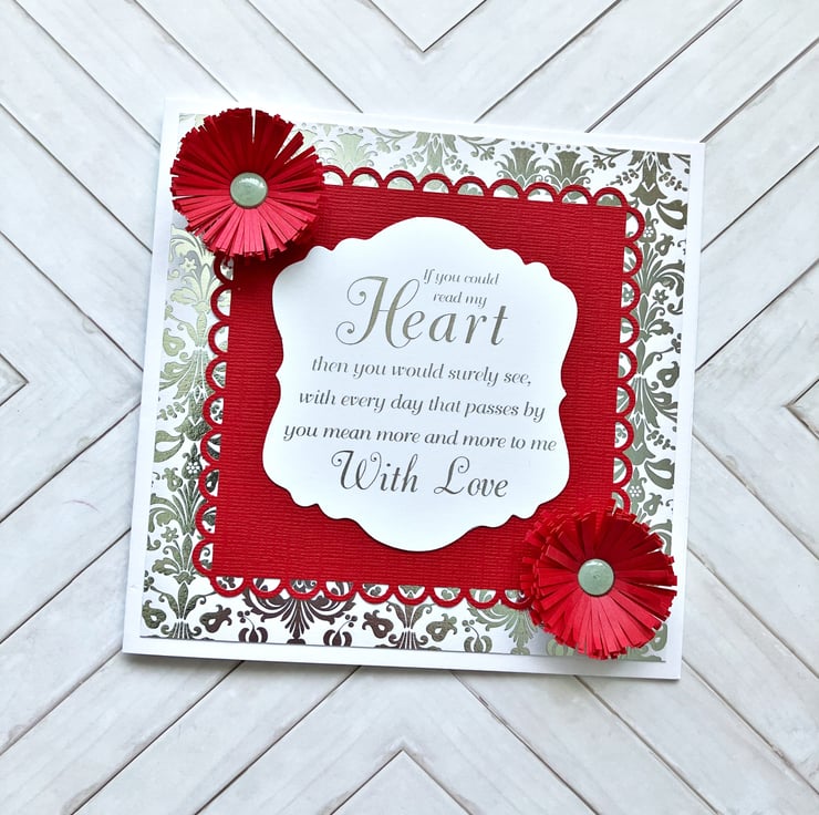 The card comes wrapped in silver polka dotted tissue paper and is presented in a beautiful handmade gift box decorated with a silver band and a red wooden heart. Box dimensions 16cm x 16cm x 1.5cm approx.