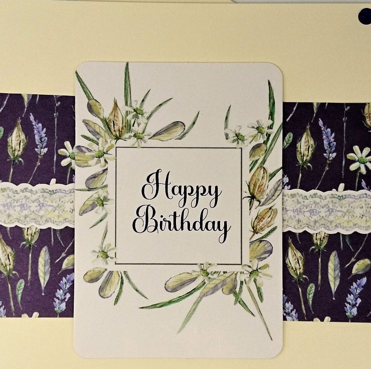 "Happy BIrthday" Birthday card featuring beautiful lavender, daisies and grasses. Flowers in general are known to lift the spirit and lavender in particular exudes grace and calmness. Purple is a royal colour and denotes elegance, refinement, and luxury, so what better way to send Birthday Wishes. All my cards are handmade with love in my wee studio in Argyll, Scotland.