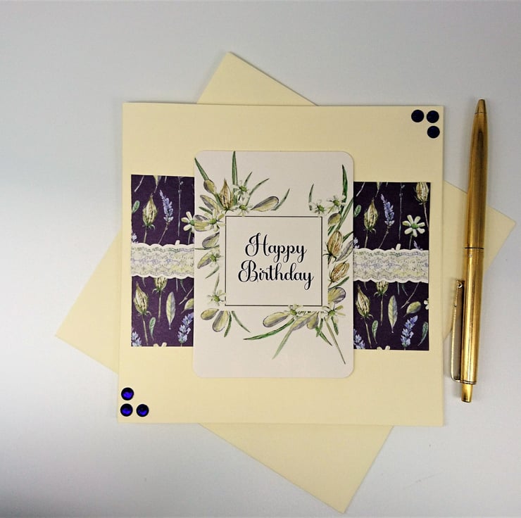 DESCRIPTION:A top quality 225gsm ivory 6 in square card, layered with a deep purple floral background, co-ordinating scalloped floral band plus a pale green and white bouquet of flowers surrounding a Happy Birthday sentiment. The card is finished with 6 matching deep purple gems.