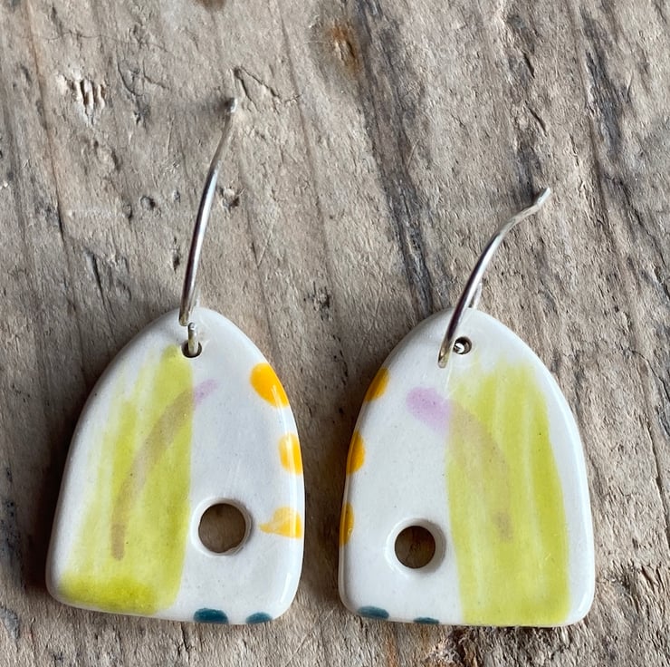 These arched earrings are hand formed using Earthenware Clay before being painted using a mixture of Clay slips and Underglazes.