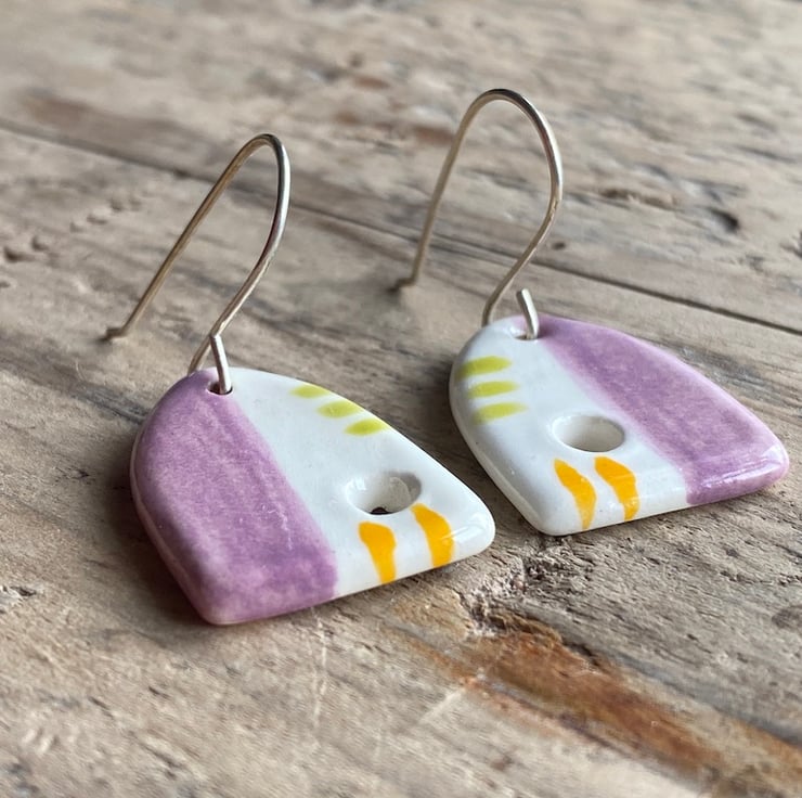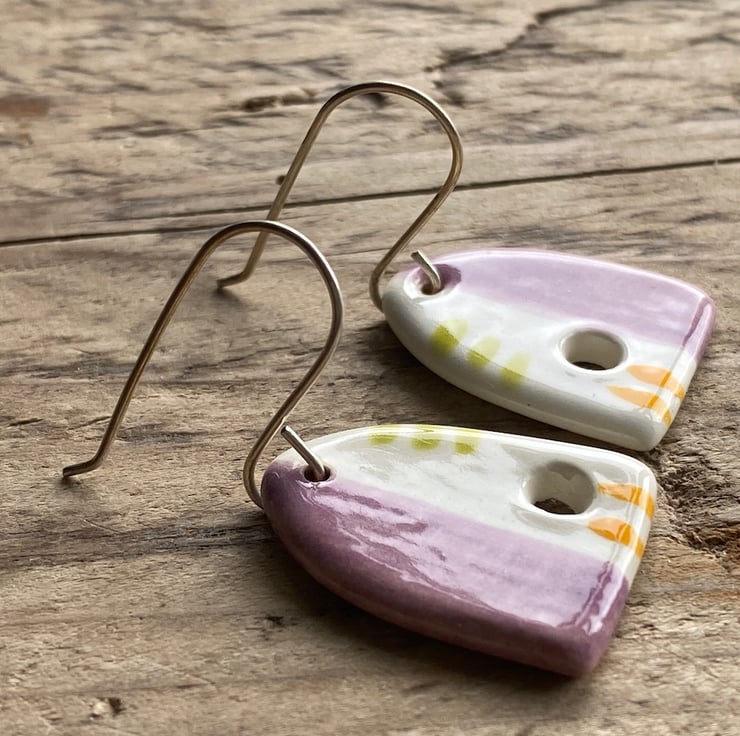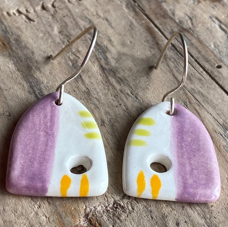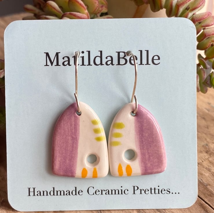 These arched earrings are hand formed using Earthenware Clay before being painted using a mixture of Clay slips and Underglazes.