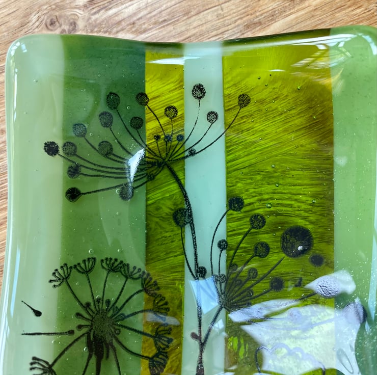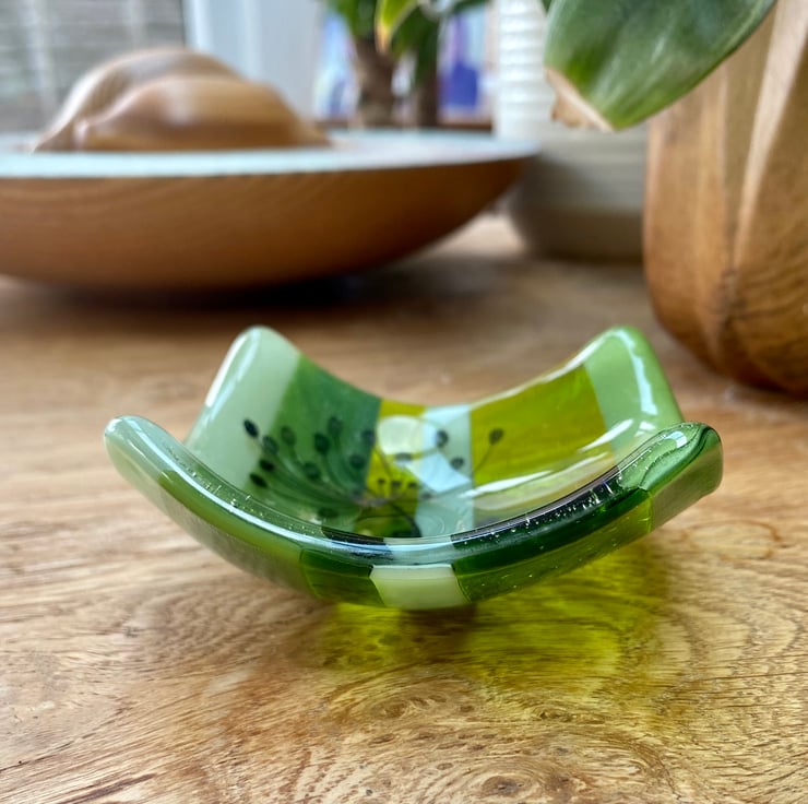 Rich shades of opal and transparent green glass are used to make this little trinket dish. A layer of clear glass is added to the top to give shine and a black enamel seed head pattern is added during a second firing in the kiln. A final third firing moulds the piece into its shape.