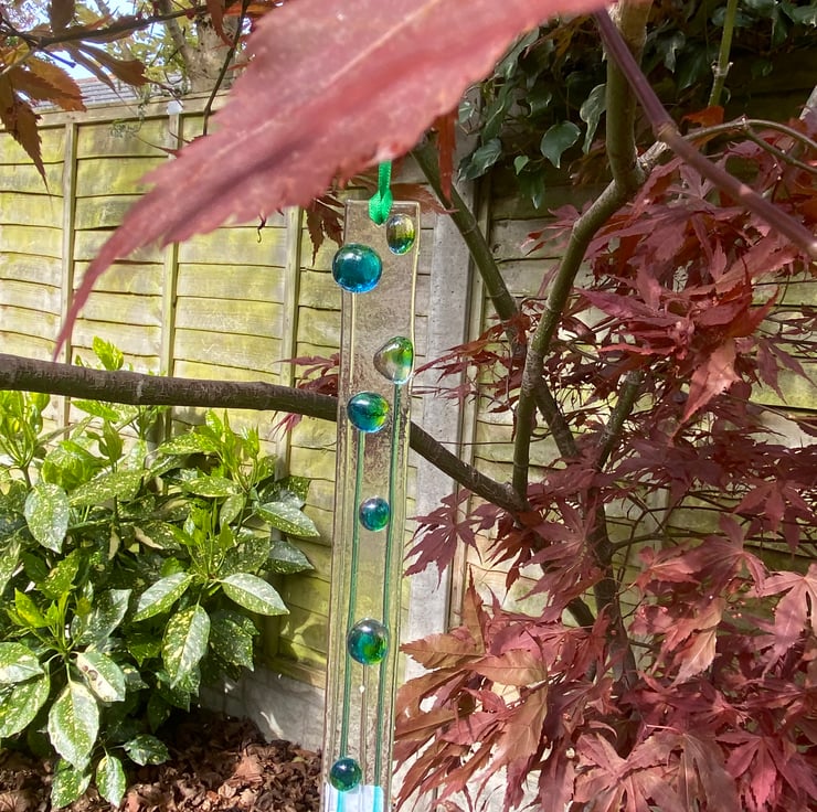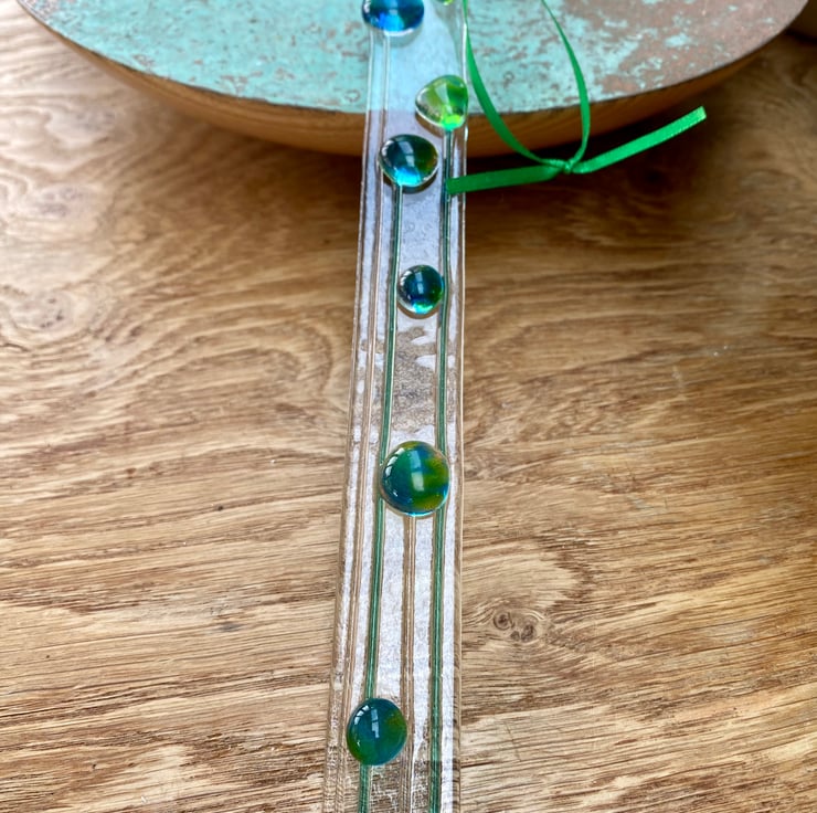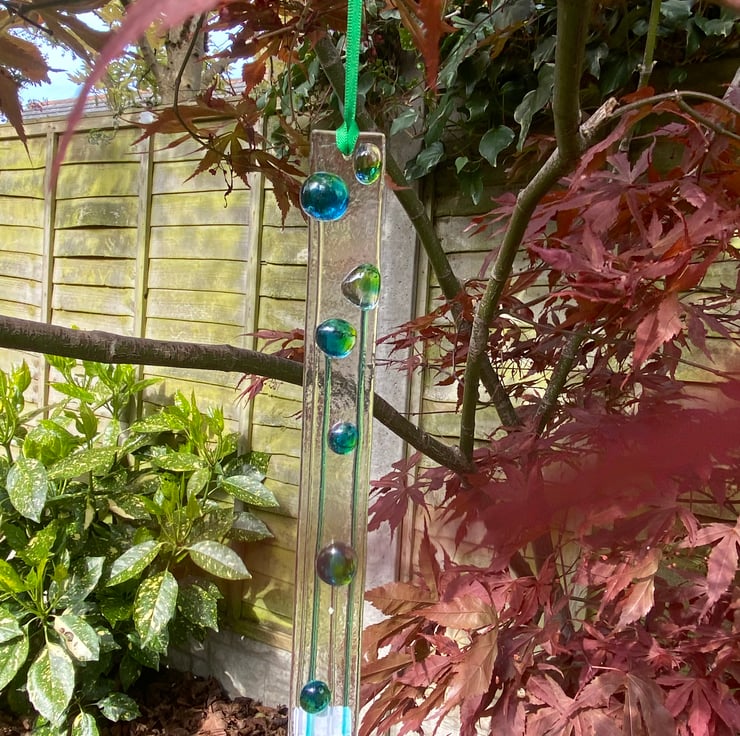 Measuring approximately 20cm long by 2cm wide, it can be hung inside to catch the light from the window or outside in the garden and has a green ribbon attached.