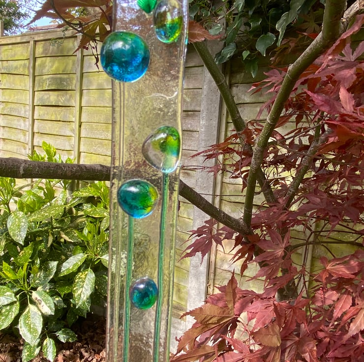 This long, narrow hanging decoration is decorated with shiny nuggets of blue and green glass which have been hand cut and fused in the kiln before adding to the clear glass base.