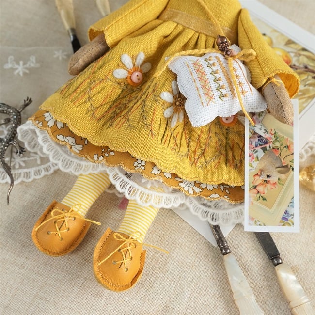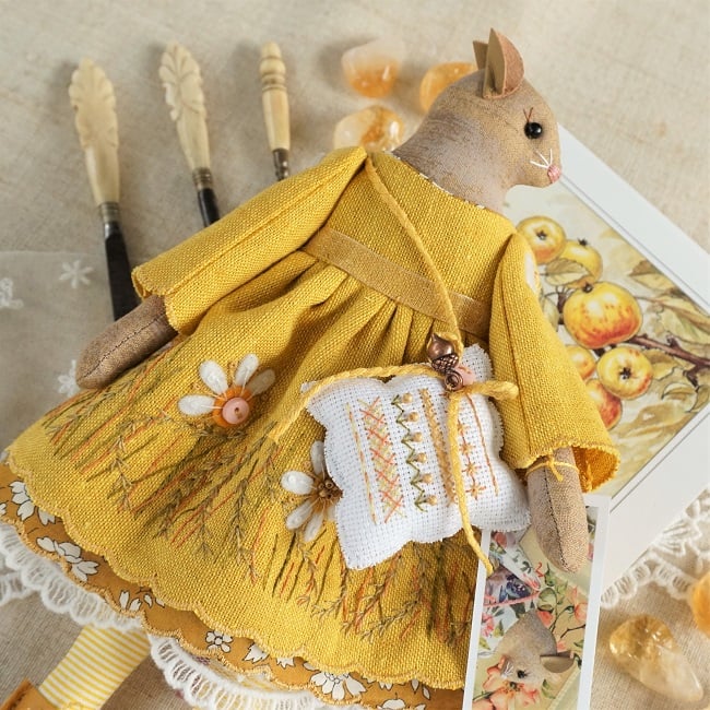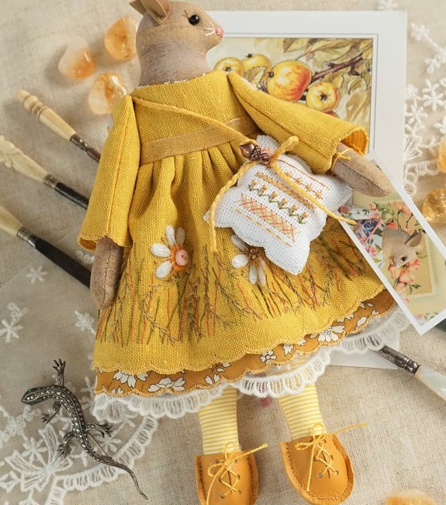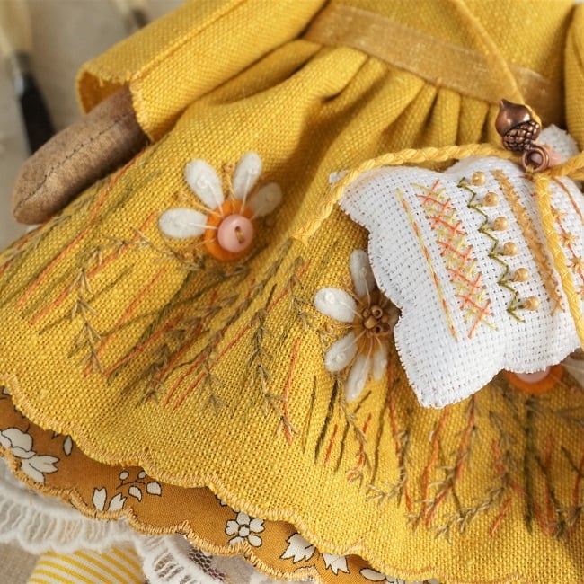 This is Chamomile, a special order for Stephanie. She is a hand embroidered mouse with little leather ears and tail. She is dressed in a an applique and embroidered dress with chamomile flowers abounding. She has coordinating underskirts in Mustard Liberty Lawn Capel with tulle lace and cotton lace bloomers. Her dress is finished with organza ribbon, tiny buttons and little leather shoes.