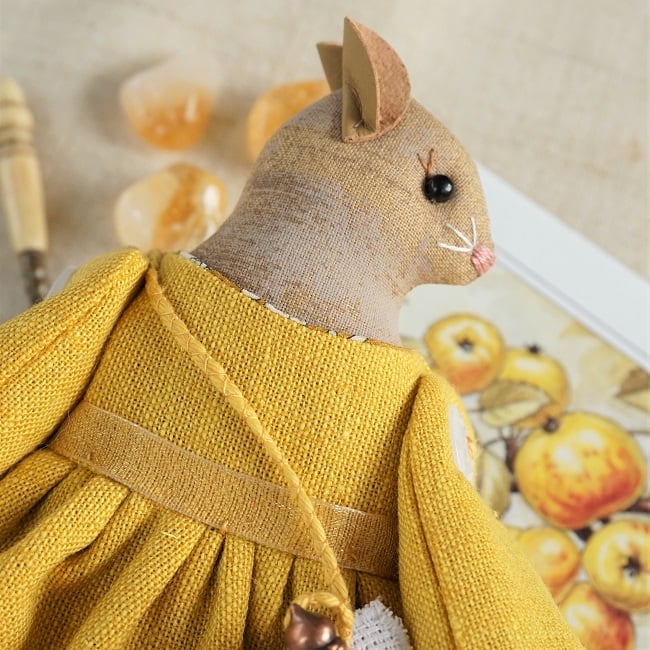 She is softly stuffed with chsmomile in her stuffing for a gentle scent and she has a tiny yellow citrine crystal at her heart for love. She has a brass ring to her back in case you want to place her on the wall.