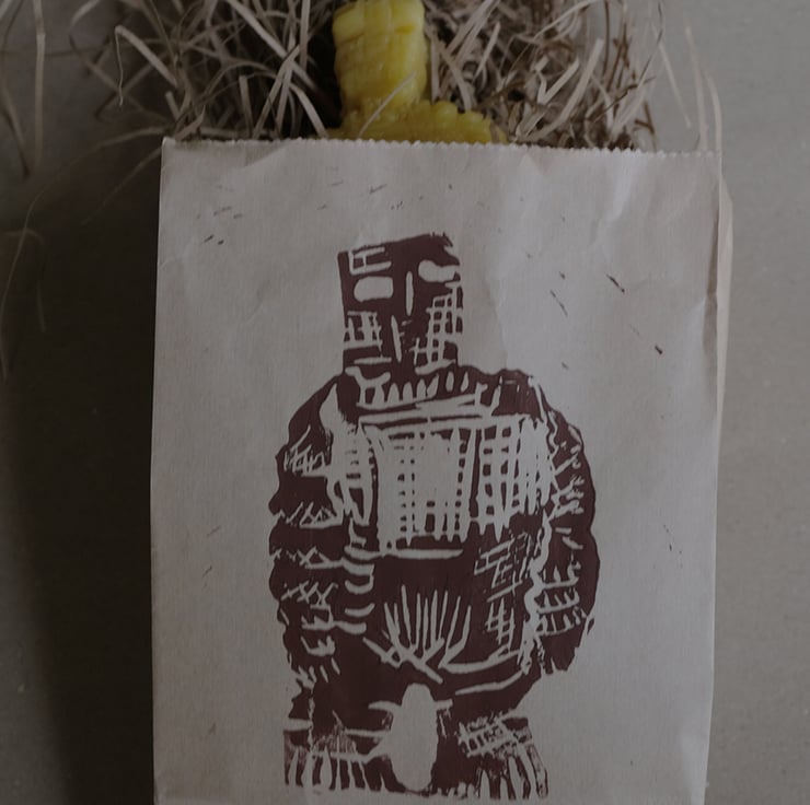 Your candle will be packed in shredded brown paper in its own special bag printed with a Lino image of the exact candle.