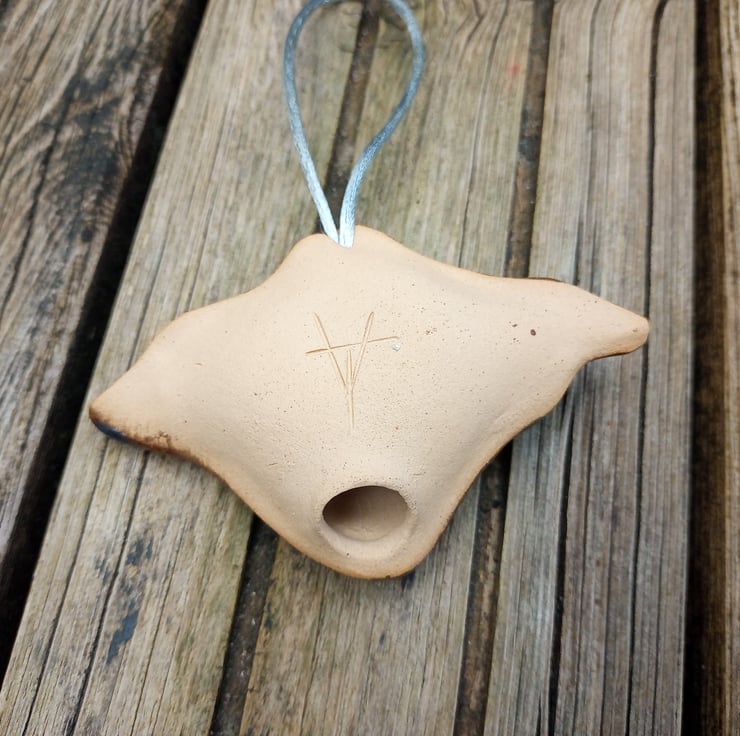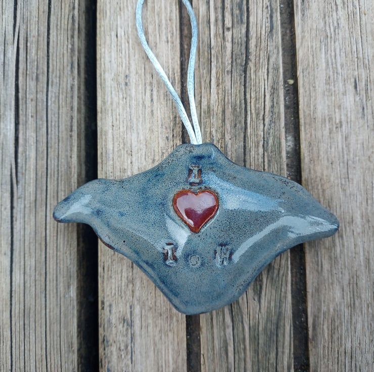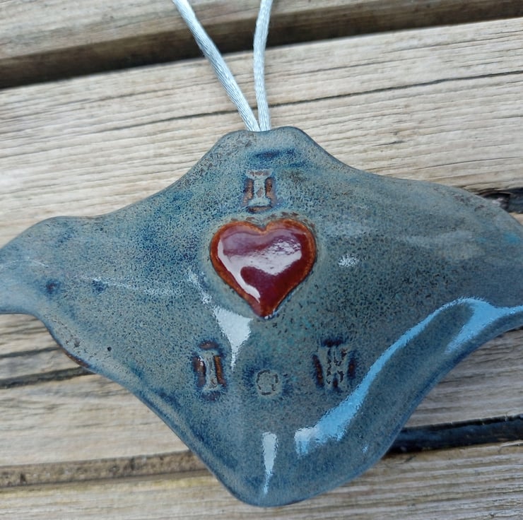 An ornamental I love Isle of Wight. Hanging ornament or for the top of a garden cane. 10.5 X 6.5cm approx. As they are handmade each one has small differences. You will receive one from the batch of this glaze firing.