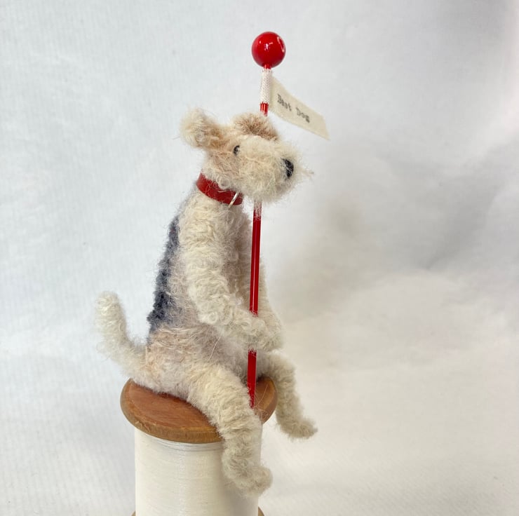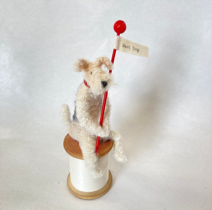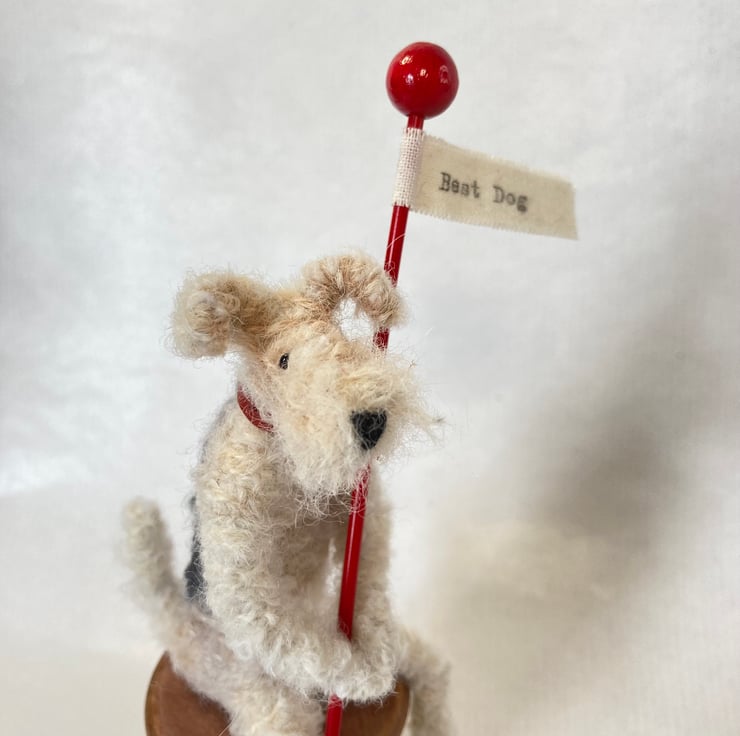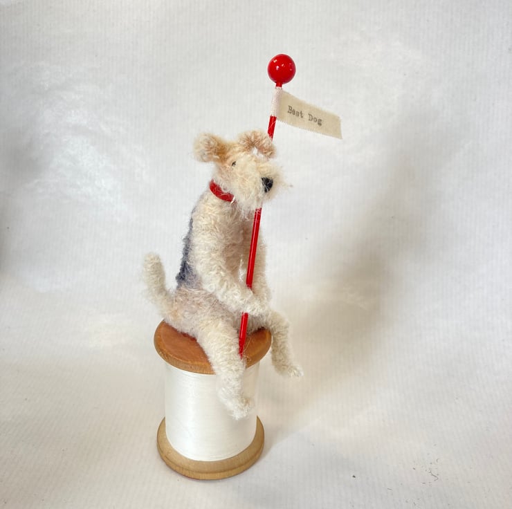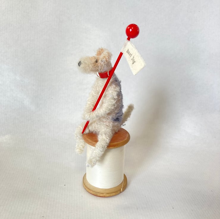 Duke is sitting pretty on a large vintage cotton reel and is holding a flag which reads “Best Dog” on one side and “ Woof Woof” on the other. He has a handmade red leather collar and is made from wire and Alpaca Bouclé wool.
